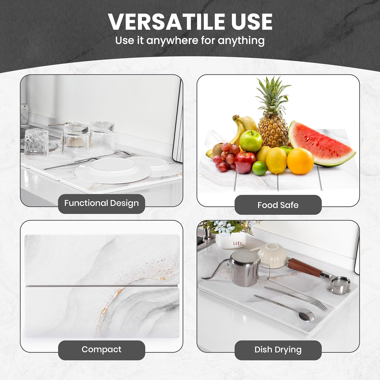 - 【MULTIPURPOSE】This black stone drying mat for kitchen counter is versatile and offers endless practicality and elegance with generous space to store multiple dishes, cups, bottles, kitchen utensils and other tableware. Not limited to only kitchen use, but you can also use it as a bath mat, plant saucer, vegetable holding stone mat, or even underneath a pet feeding station.