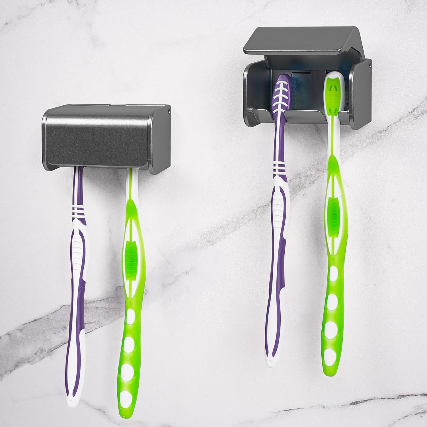 2 PCS Toothbrush Holder Wall Mounted with Cover for Bathroom, 2 Slots Toothbrush Storage Organizer for Shower, Self Adhesive Toothbrush Hanger Rack for Dorm, Cabinet (Brushed Grey)