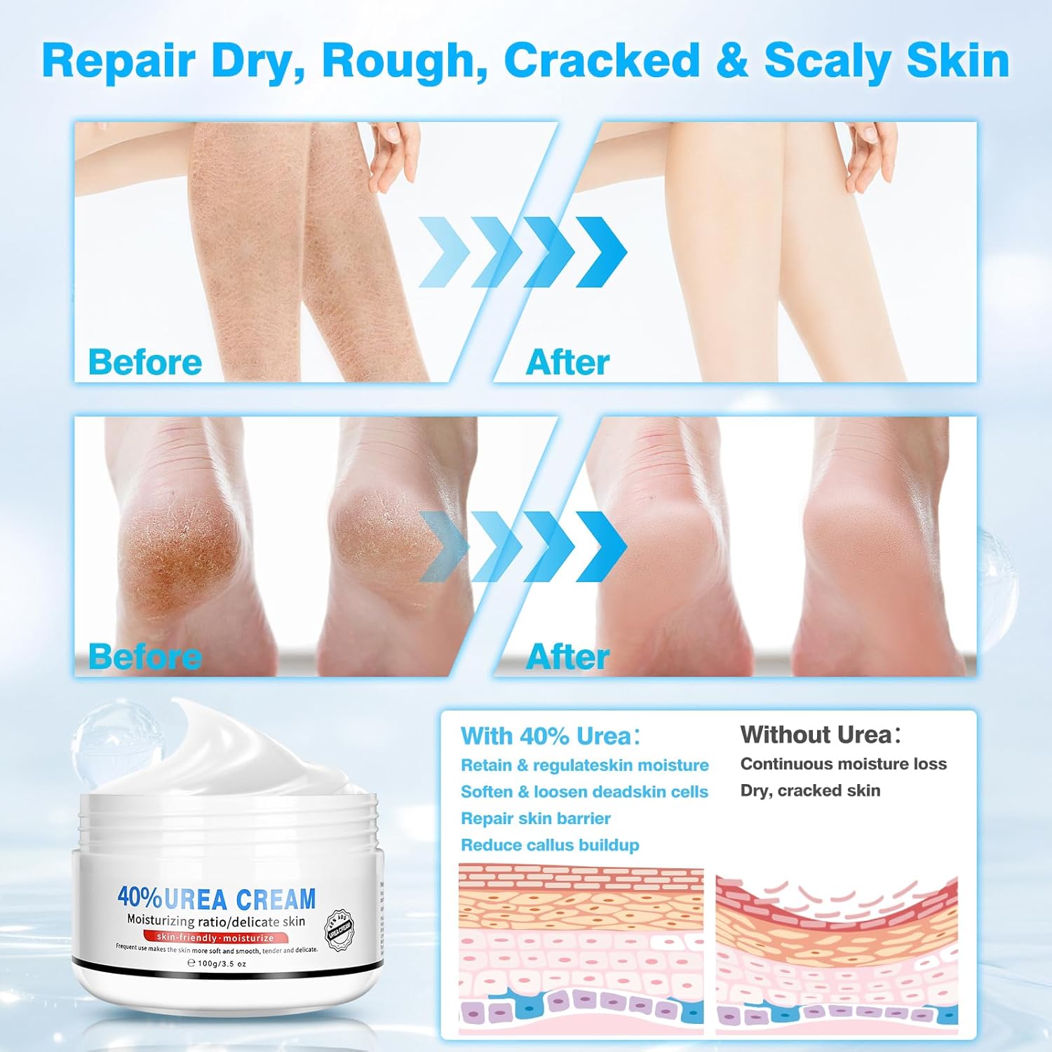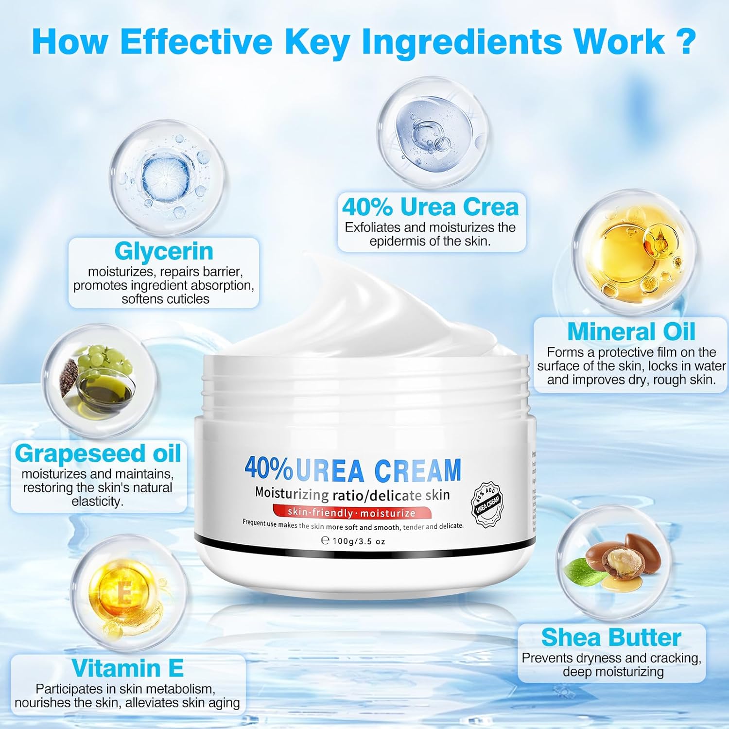 - Deep Repair Cream for Cracked Heels: Ultra-Moisturizing Foot Cream is designed to solve foot problems. This foot lotion combines powerful moisturizing ingredients such as Urea (40% concentration), Shea Butter, Grapeseed Oil, Mineral Oil and Glycerin. These ingredients are gentle and safe and work synergistically to deeply nourish, moisturize and soften dry, rough skin