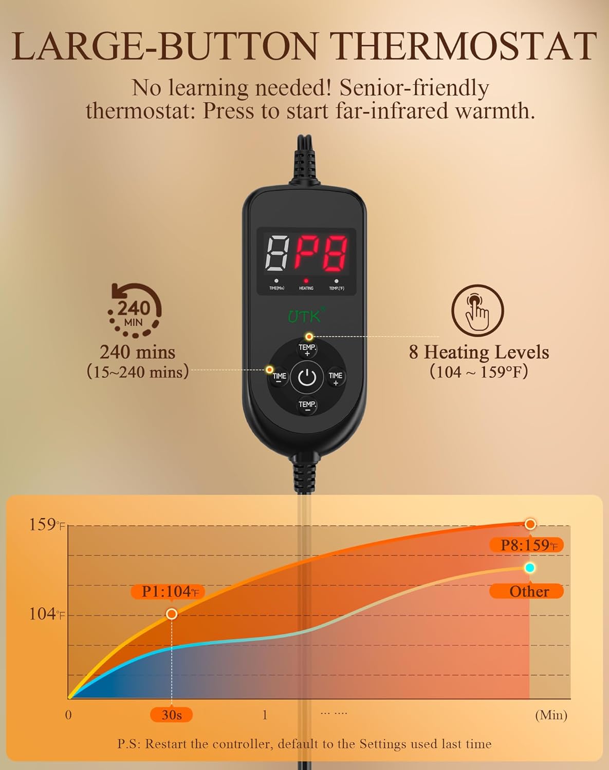 - Special Feature : 240 Mins Timer, 8 Heat Settings (Max up 159°F), Automatic Shut Off, Far Infrared Heat Therapy,provide 6x pain relief, Overheat Protection 240 Mins Timer, 8 Heat Settings (Max up 159°F), Automatic Shut Off, Far Infrared Heat Therapy,provide 6x pain relief, Overheat Protection