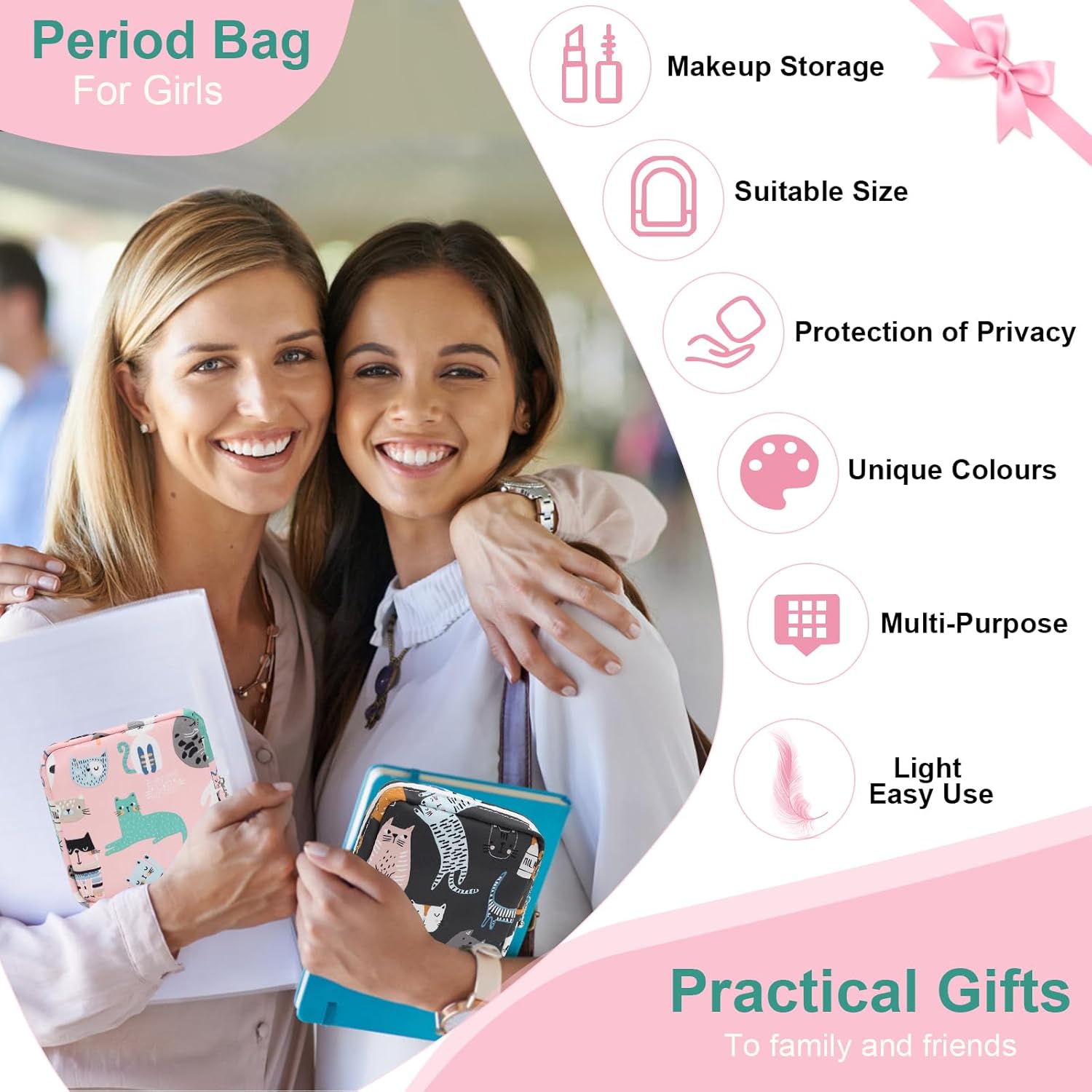 - đ ăProtect Privacy for Girlsă- Just confidently take the sanitary pad storage bag and go to the toilet! This period pouch is specially designed for holding feminine products during menstruation. Invisible design allows you to use sanitary napkins in a discreet way. Can more effectively help you avoid embarrassment due to special periods and fully protect your privacy. Good first period gifts for girls.