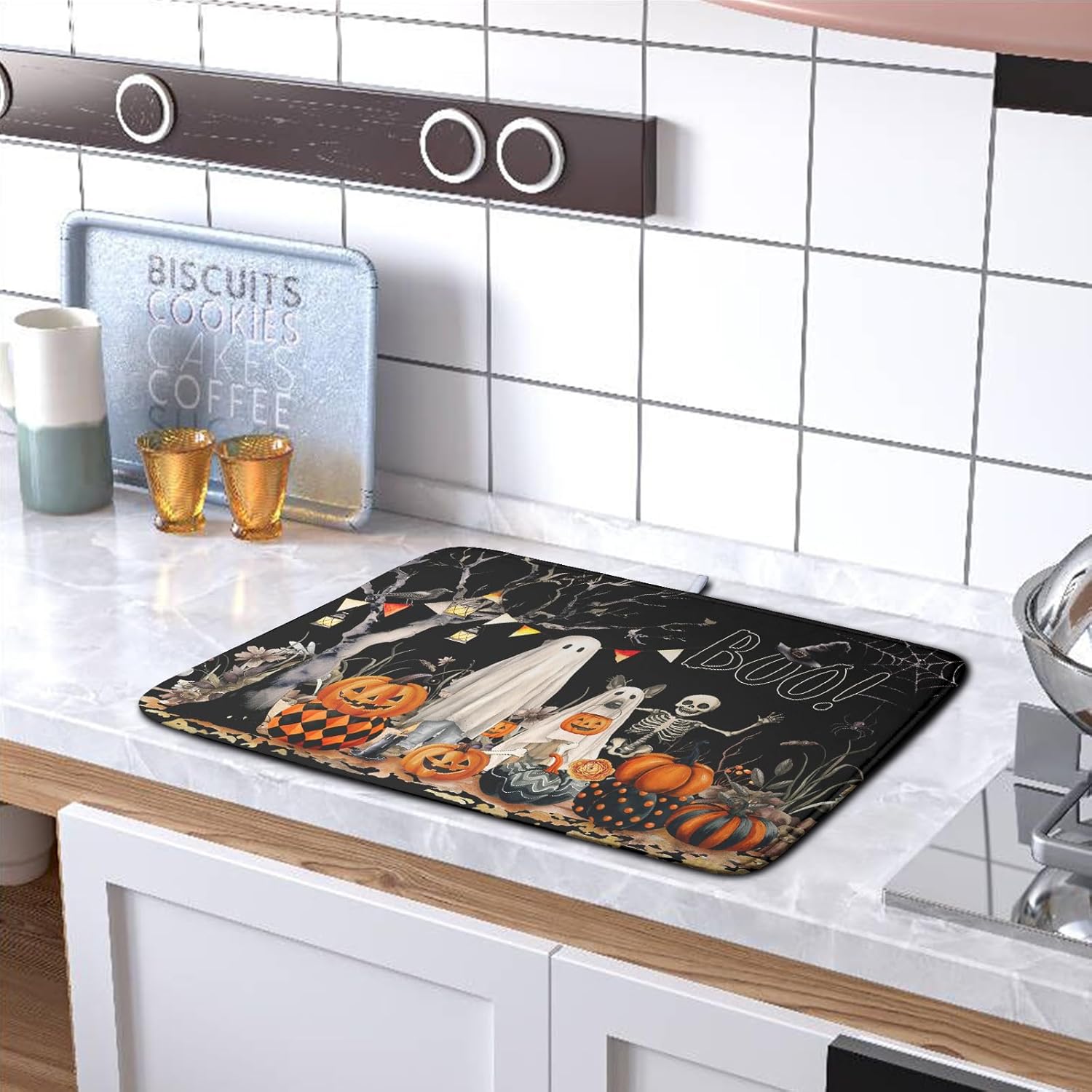 Halloween Dish Drying Mat for Kitchen Counter 18x24 Inch Black Ghost Pumpkins Dog Boo Skull Dishes Drainer Mats Absorbent Microfiber Washable Dish Draining Pad for Sink Coffee Bar