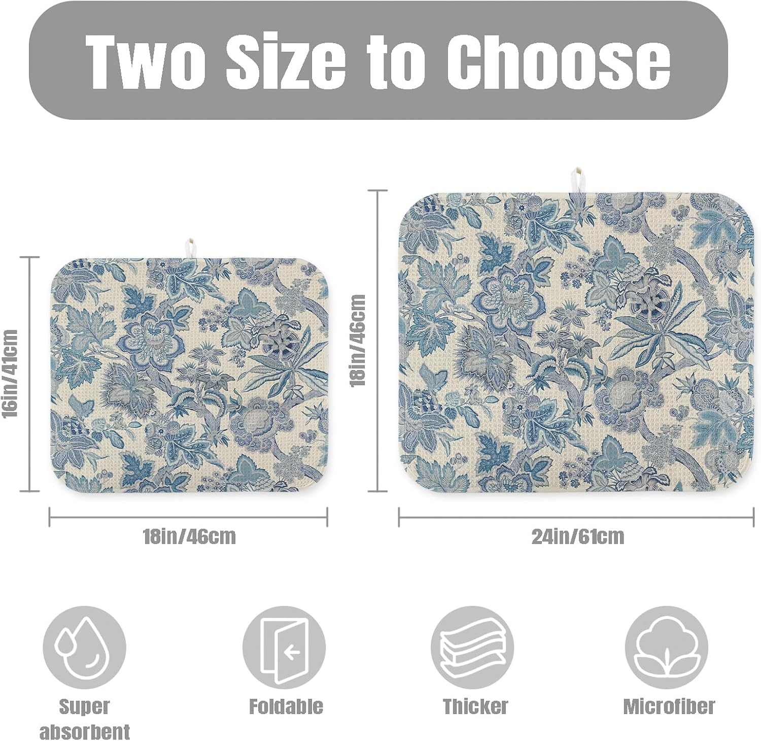 Dish Drying Mat for Kitchen Counter Large 16" x 18" Retro Blue Flower Absorbent Microfiber Dishes Drainer Rack Mats Pad Reusable Washable