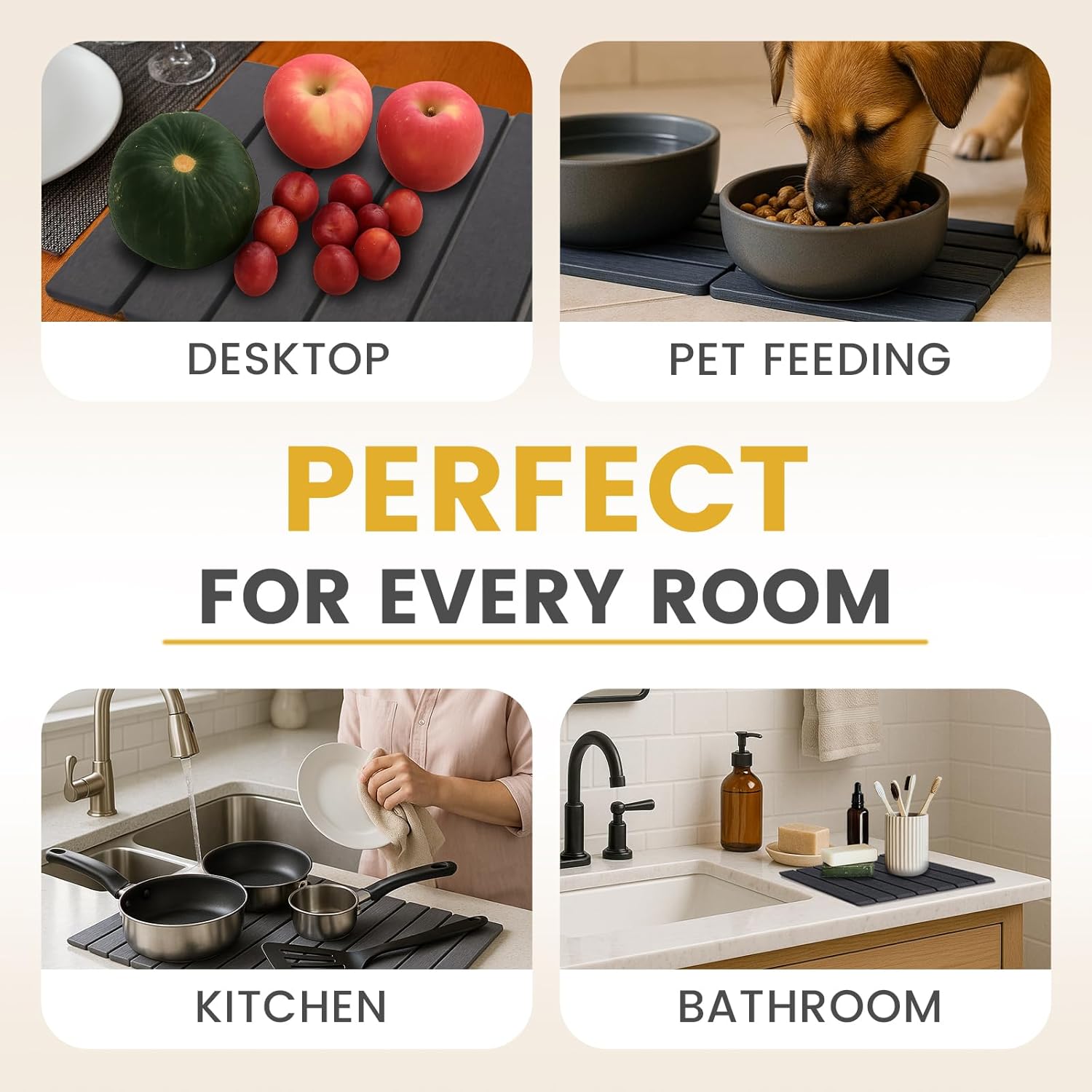 - 【Versatile for Kitchen & Bathroom】Whether by the sink or on the vanity, this sleek dish drying pad adapts to various household needs. The neutral gray tone fits any decor while adding modern style to your stone mat setup