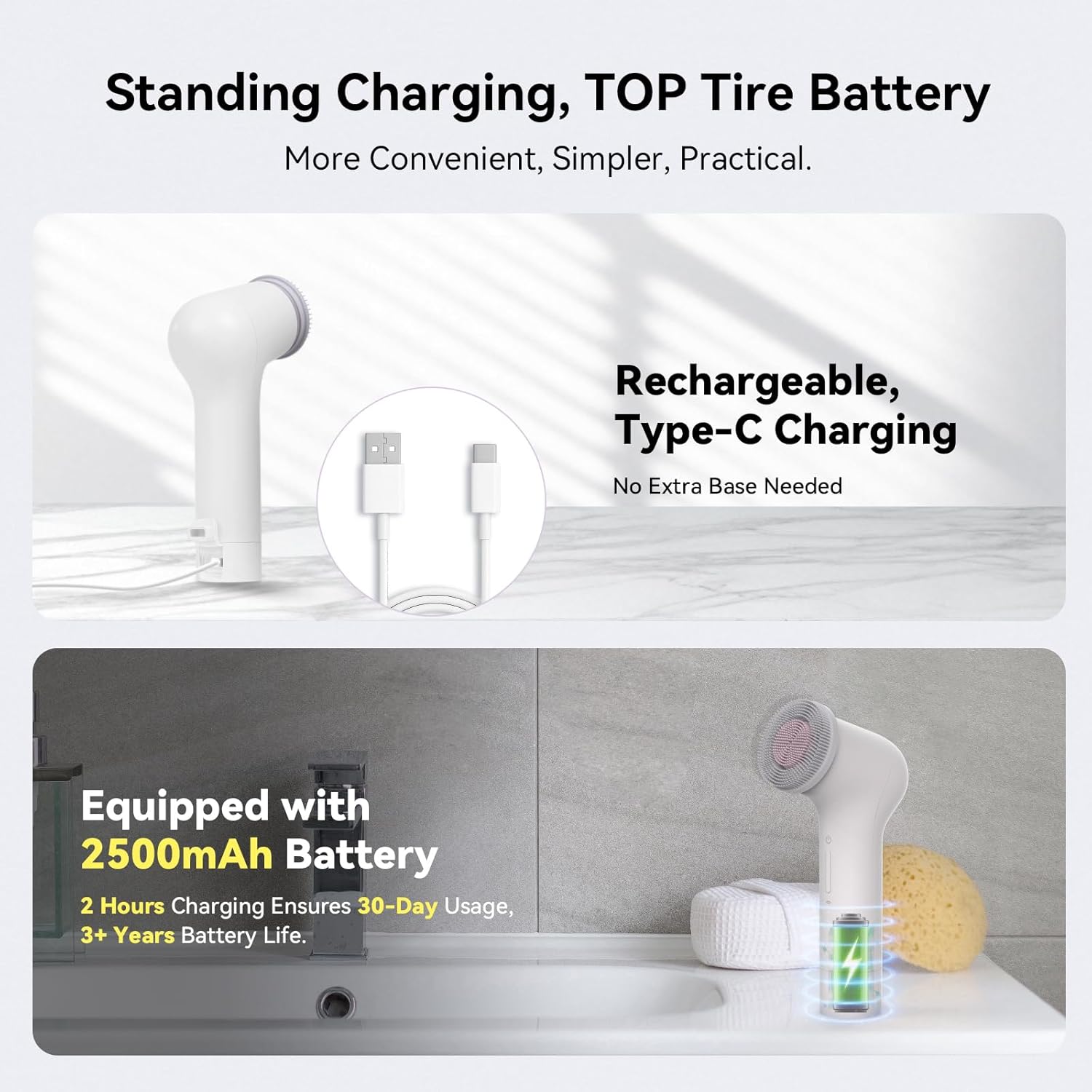 - 【Long-Lasting Rechargeable Battery】This rechargeable face scrubber (a standout electric facial cleansing brush) has a 2500mAh battery: charge 2 hours, use 30 days. It lasts 3 years, powering both the Silicone facial scrubber and exfoliating face scrubber heads reliably—whether at home or traveling.