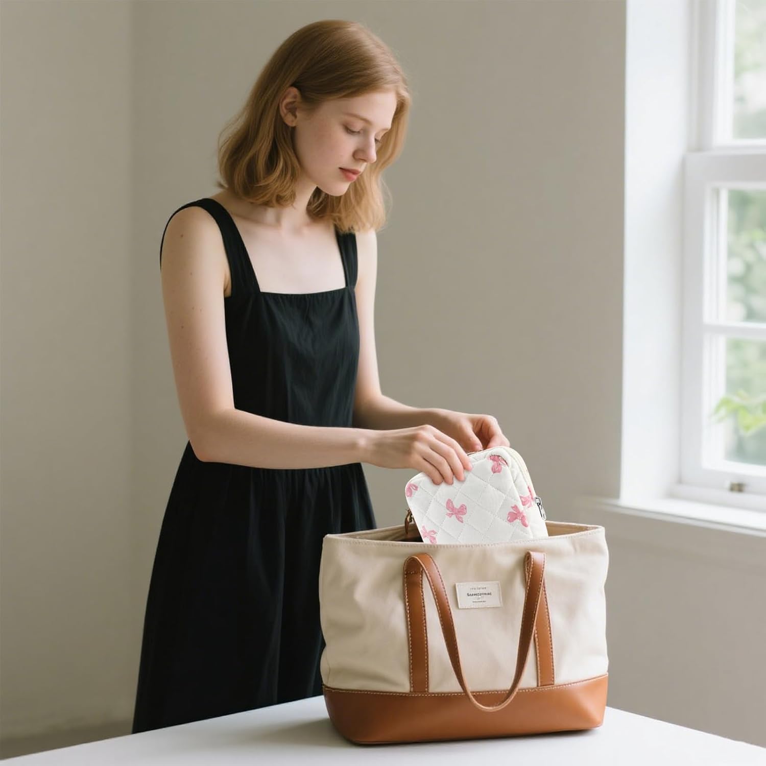 - HIGH QUALITY OF SMALL MAKEUP BAG FOR TRAVEL: Our period pouch is made of high quality cotton and hard zippers, which are colorfast, odorless and hard, and the bow pattern color of our mini makeup bag is made of green natural dyes. The makeup organizer bag has a beautiful and stylish appearance, and the interior is spacious enough to hold a lot of travel essentials, making it a quality and practical small makeup pouch for purse