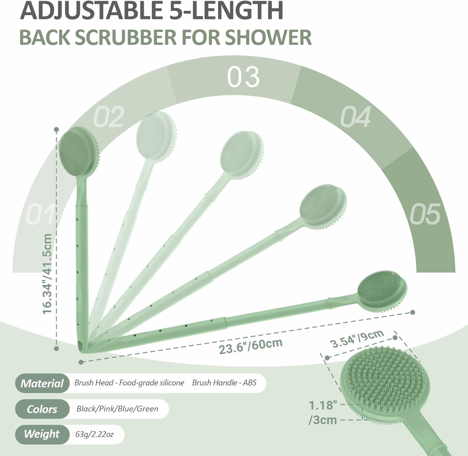 Adjustable Silicone Back Scrubber for Shower, 16''- 24'' Extendable Shower Back Scrubber for Rich Foam, 5-Length Back Brush Bath Brush with Dual-Side Head and Super-Lathering Bristles(Green)