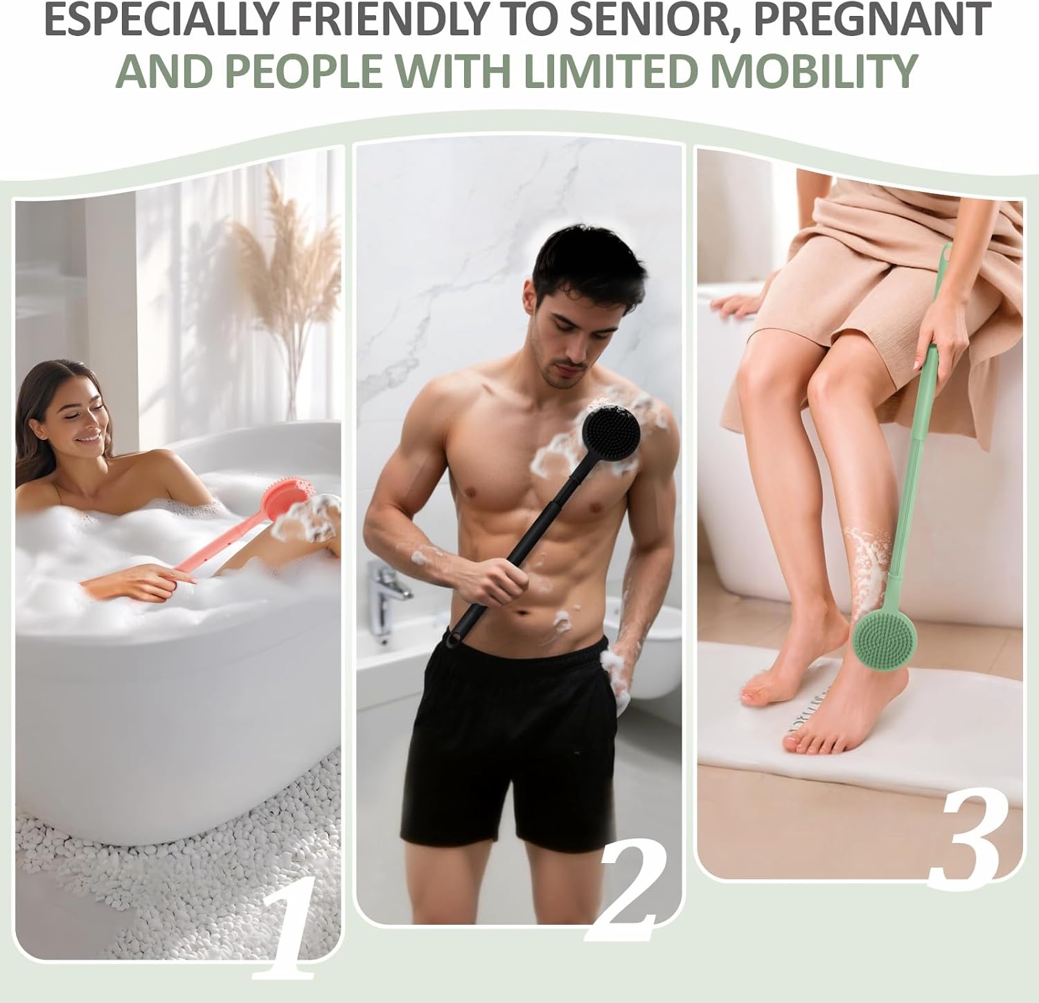 - 【Adjustable 5-Length Extra-Long Handle】Back brush's handle can be adjusted to five different lengths to meet different needs. Shortest one is perfect for hand-hold brushing, medium length for scrubbing back and legs, longest one for brushing feet and toes without bending, which is especially friendly to seniors, pregnant and people with limited mobility. The unique extendable handle brings excellent non-slip experience to your shower!