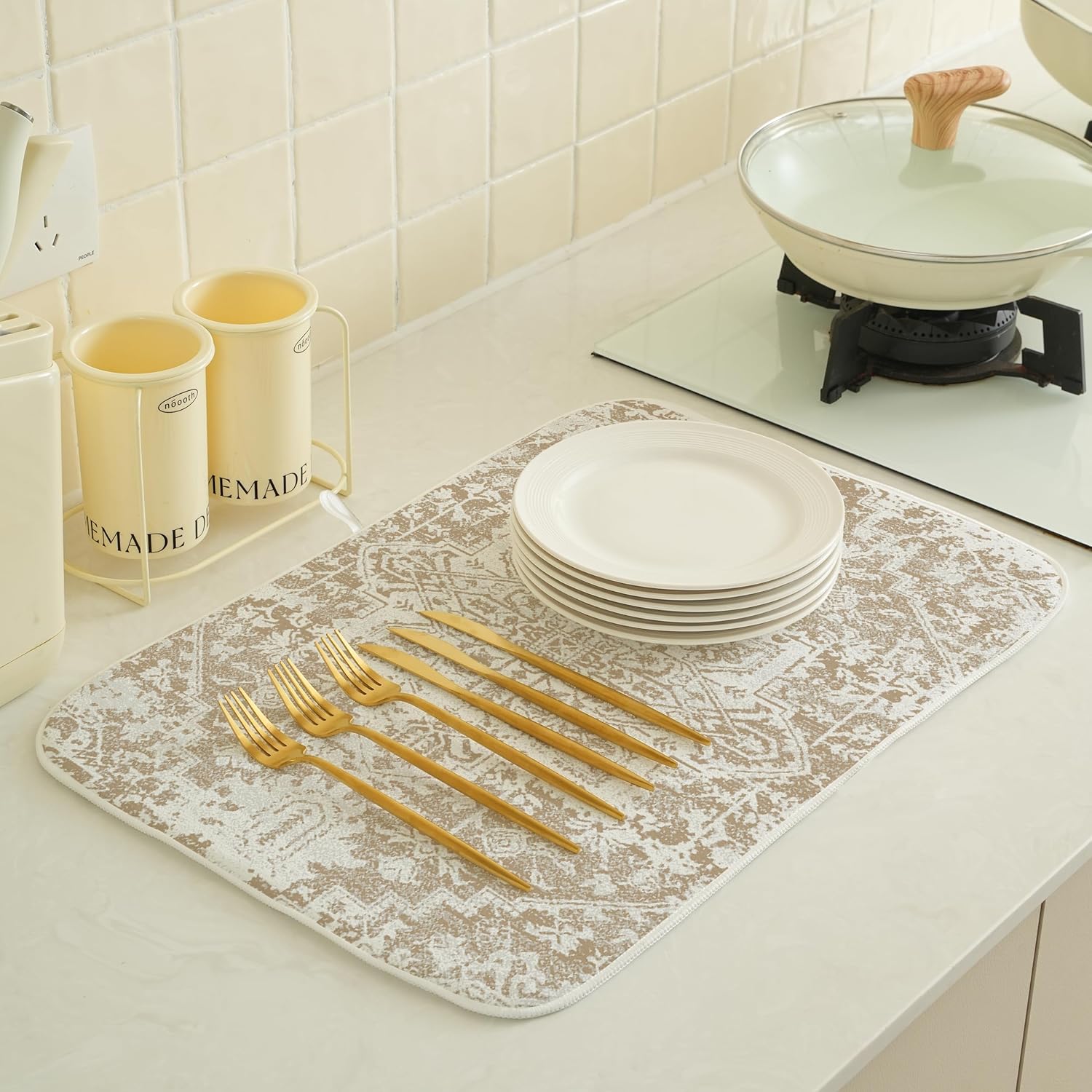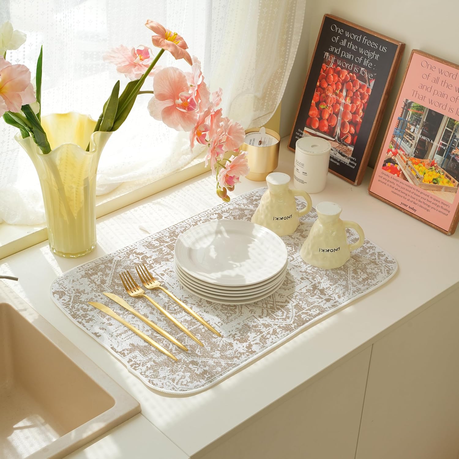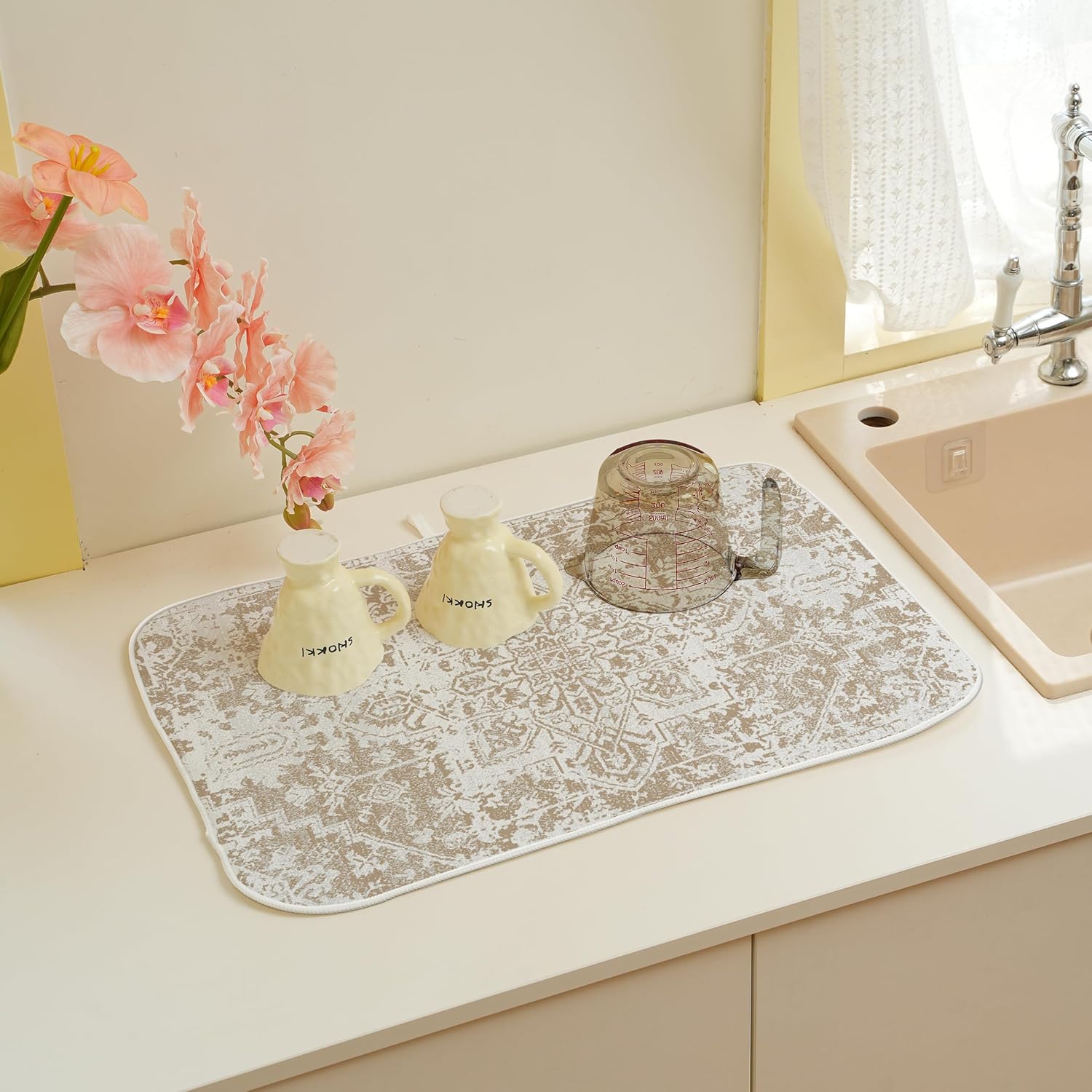 Brown Dish Drying Mat for Kitchen Counter, 18x24 Inch Coffe Boho Style Absorbent Dish Drying Pad Heat Resistant Mat Coffee Bar Mat Dish Drainer Rack Mat
