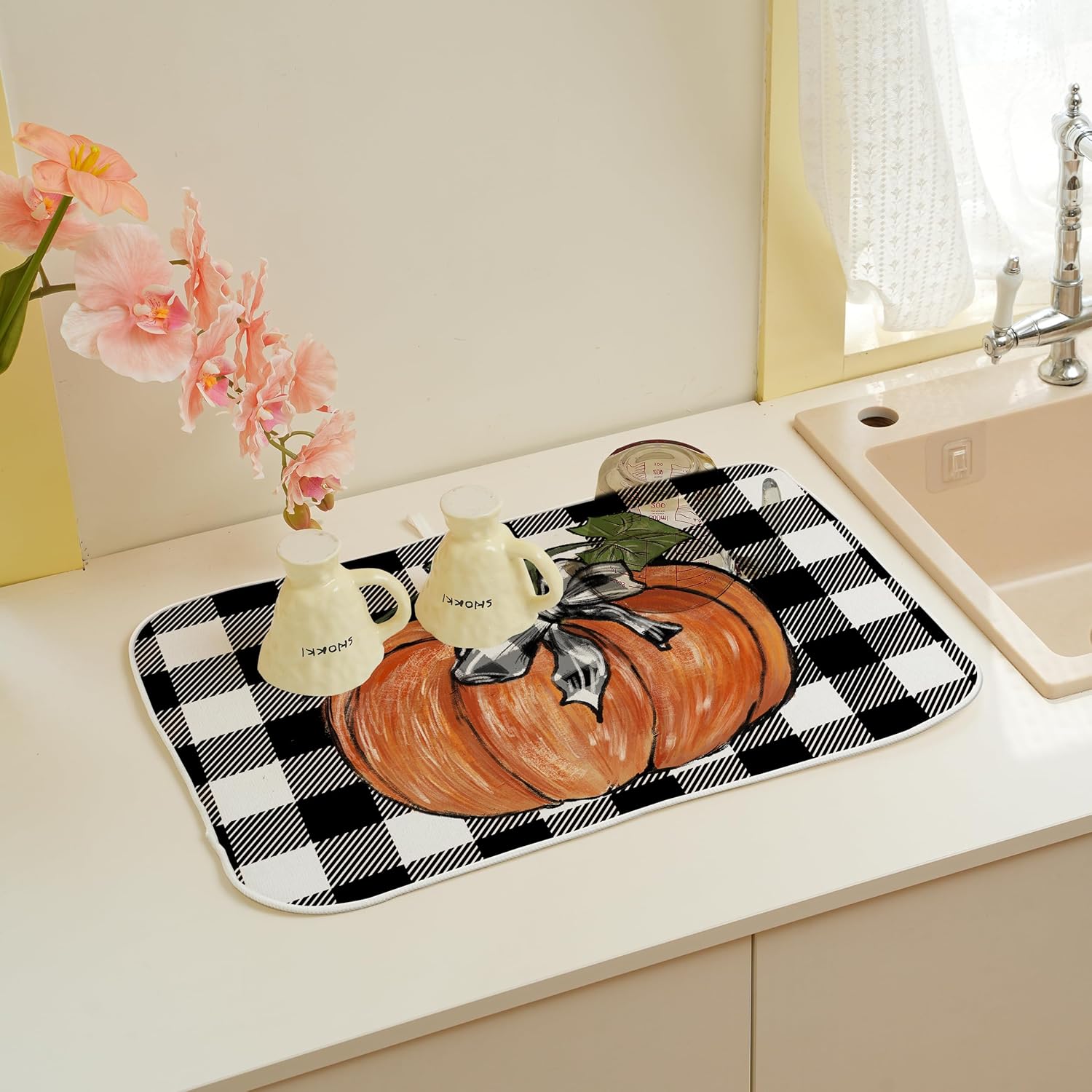 Fall Dish Drying Mat for Kitchen Counter, 18x24 Inch Buffalo Plaid Orange Pumpkin Absorbent Dish Drying Pad Heat Resistant Mat Coffee Bar Mat Dish Drainer Rack Mat