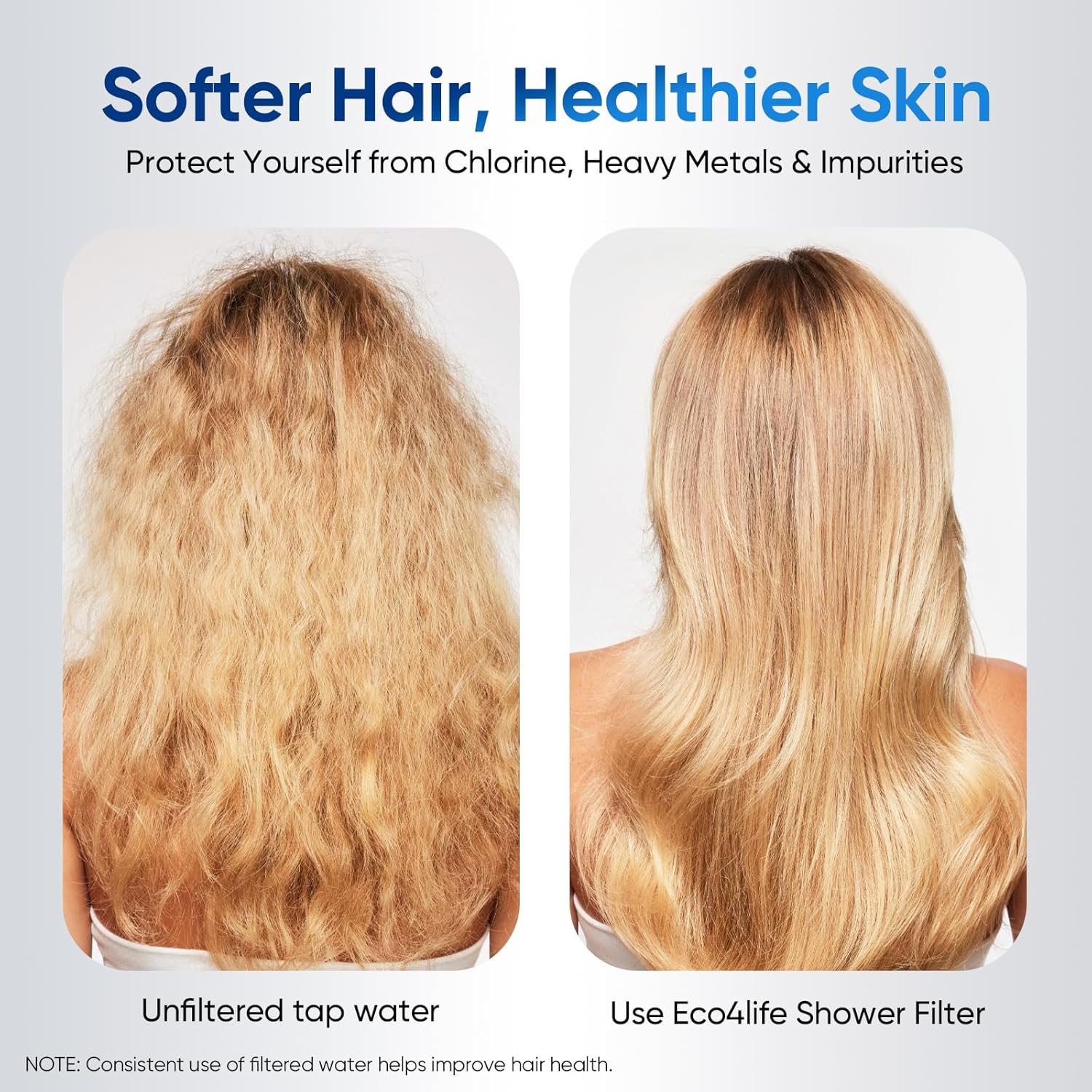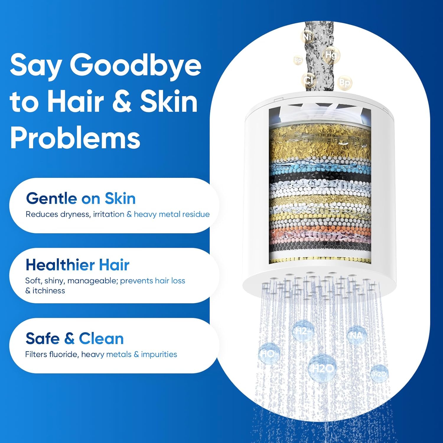 - SAY GOODBYE TO HARD WATER PROBLEMS. Tired of itchy skin, brittle hair, or a dry scalp after every shower? Our 25-stage shower head filter for hard water effectively removes chlorine, heavy metals, and sediment. Enriched with Vitamin C and E balls, it slowly releases nutrients, balances pH levels, and protects your skin while restoring shine and vitality to your hair.