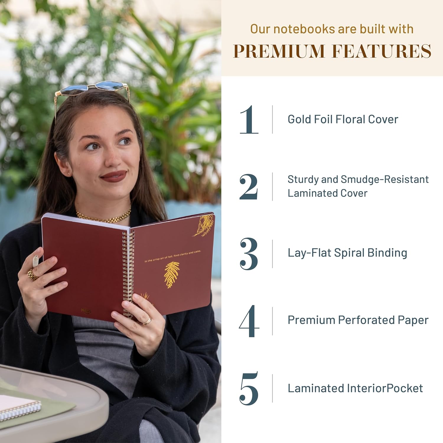 - Durable Stylish Cover: The durable spiral binding keeps pages secure while allowing our hard cover notebook to lay flat for smooth writing. Its pretty cover, combined with two laminated interior pockets, adds style and functionality.
