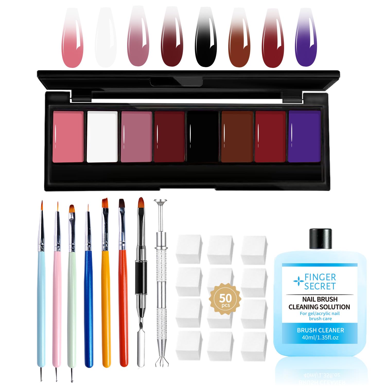- Finger Secret Ombre Gel Polish:The omber gel colors set include 1* finger secret 8 color ombre gel pat come with 50 pcs sponge+ 1*cotton claw+1*Double-headed pen+ 6-color phototherapy pen & dot drill brush set +1*40ml nail brush cleaning remover meets the nail art needs of different scenarios. Moreover, the ombre gel nail polish set is lightweight and portable, allowing you to have shiny nail art all the time.