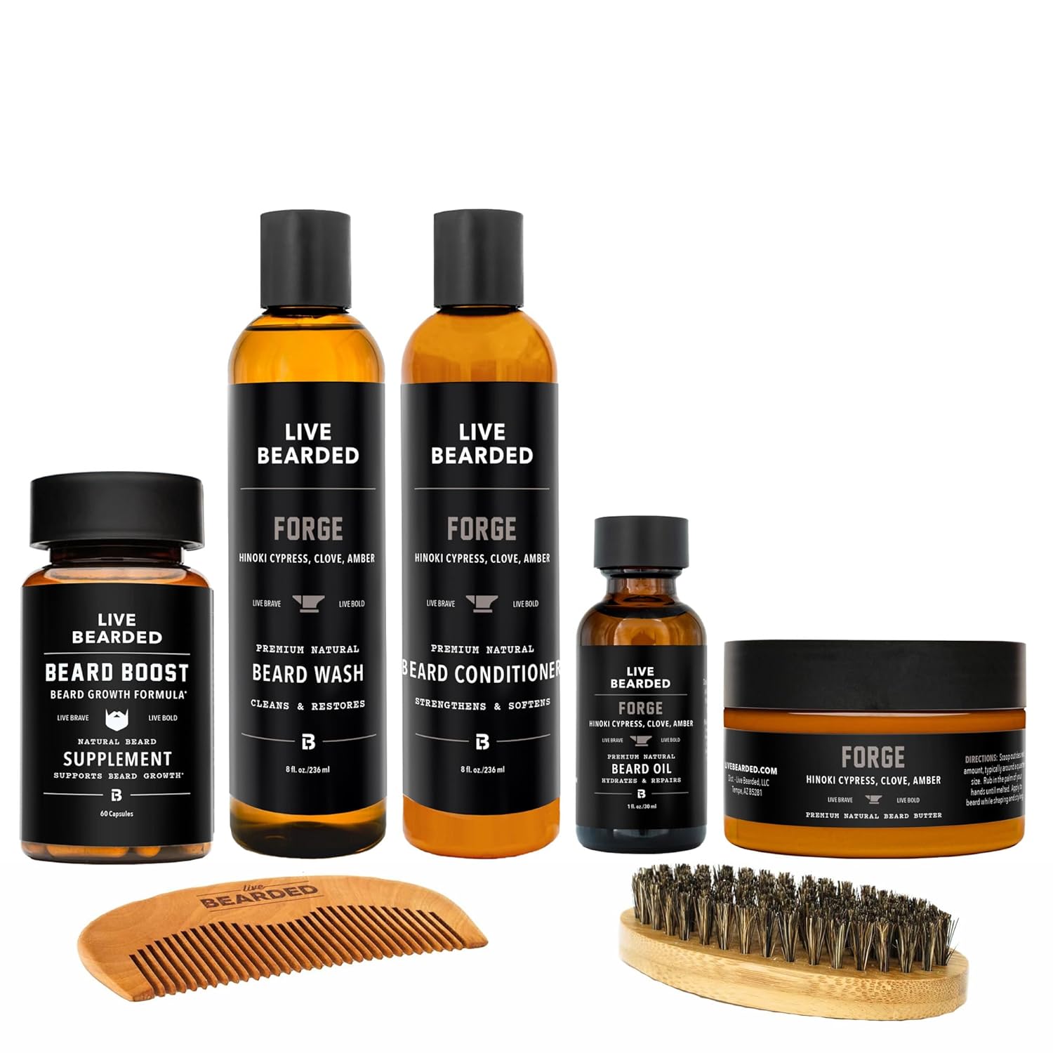 Live Bearded Total Beardsman Kit - Complete Beard Growth Kit for Men - Beard Oil, Butter, Wash, Conditioner, Vitamins, Comb, Brush | Forge - Hinoki Cypress, Clove, Amber