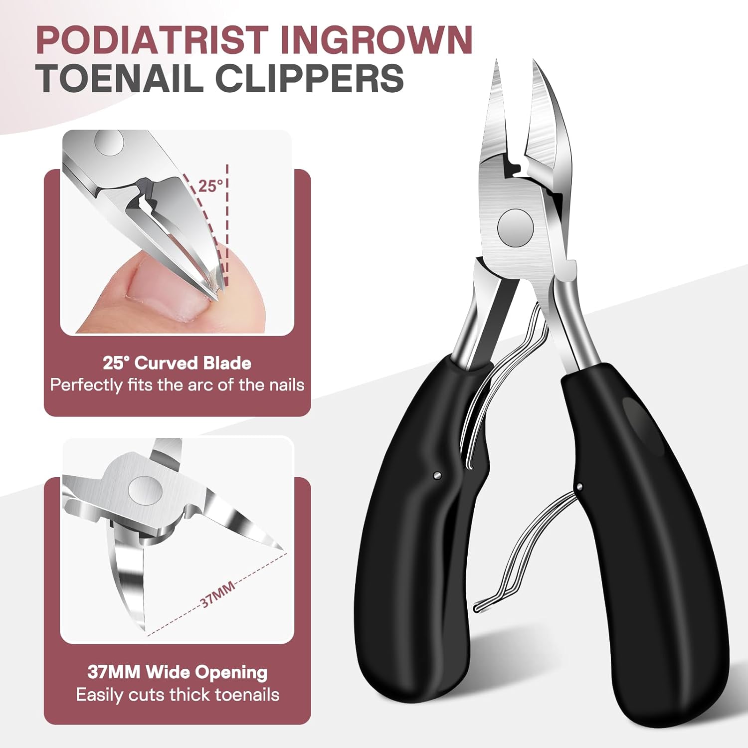 - Large Podiatrist Toenail Clippers - Built for thick, ingrown toenails, heavy duty nail clippers feature 25-degree curved blades that conform more closely to the curvature of toenails, allowing deeply penetrate into toenail groove. The 37mm wide opening and sharp blades effortlessly cut through even the thickest nails. Ergonomic, non-slip ABS handles deliver a comfortable grip that reduces effort and enhances control. And the double springs on the handle also extend the life of nail clippers.