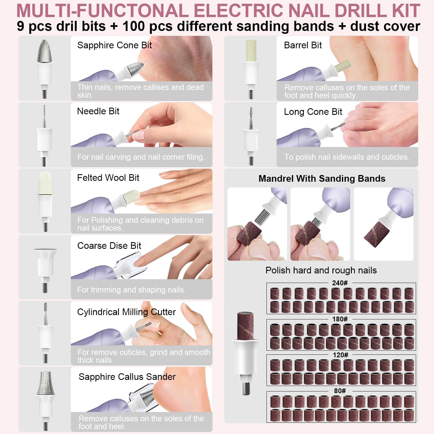2 Pack 9-in-1 Cordless Nail Drill Kit: 100 Bits, 5 Speeds – Your Ultimate Manicure & Pedicure Solution,Purple