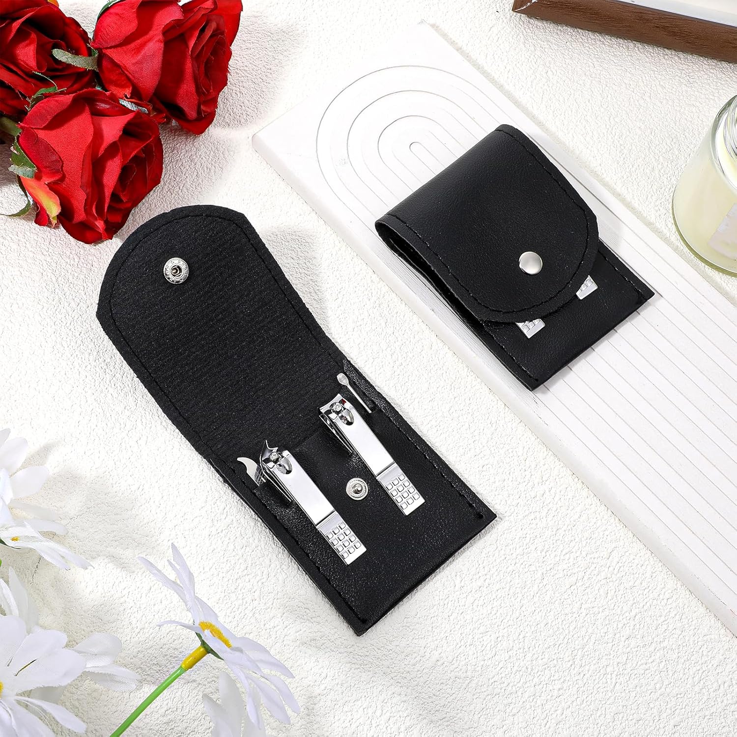 - fingernail clipper set: Each fingernail clipper set is housed in a compact travel case, measuring 2.7x3.75 inches. Lightweight and portable, it fits conveniently in any bag, making it ideal for travel.