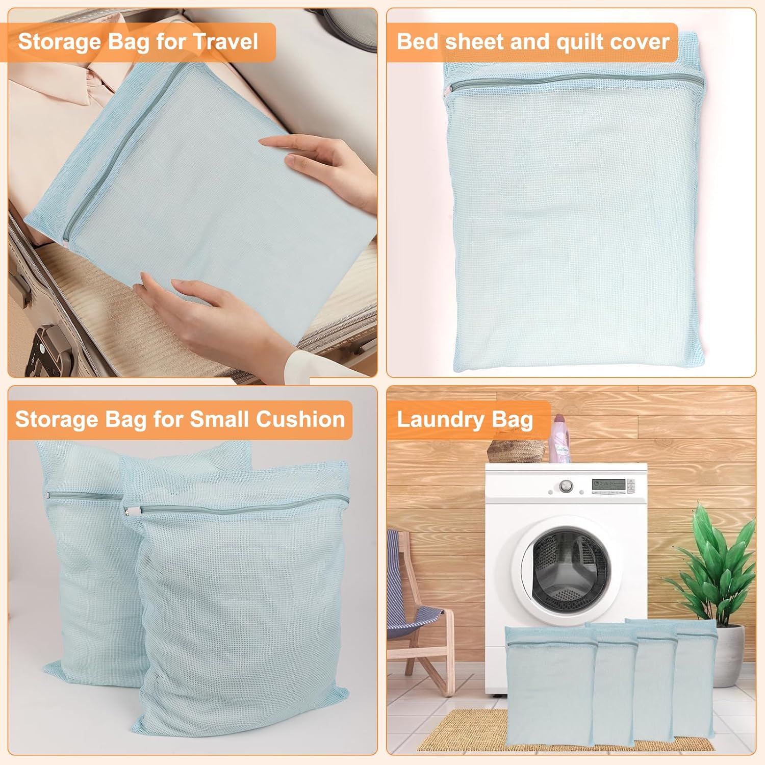 - ă Packaging List ăBLUE 4 PIECES COTTON MESH ZIPPERED LAUNDRY BAGS, LARGE AND STURDY: Our 14.96-inch x 17.71-inch laundry bags are made of pure cotton for long-lasting use!