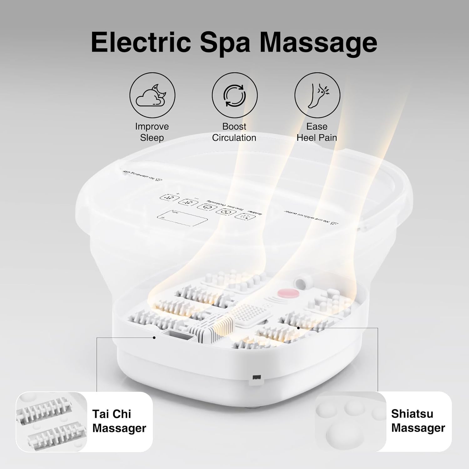 - Heated Foot Spa with Precision Temperature Control.Enjoy a soothing pedicure foot spa foot massager that maintains consistent warmth between 95°F and 118°F with 1℃ precision.The intelligent reheating function keeps water at your chosen temperature without frequent refills.This foot bath is ideal for reducing stress,enhancing sleep quality,and creating a relaxing home spa experience after work or workouts