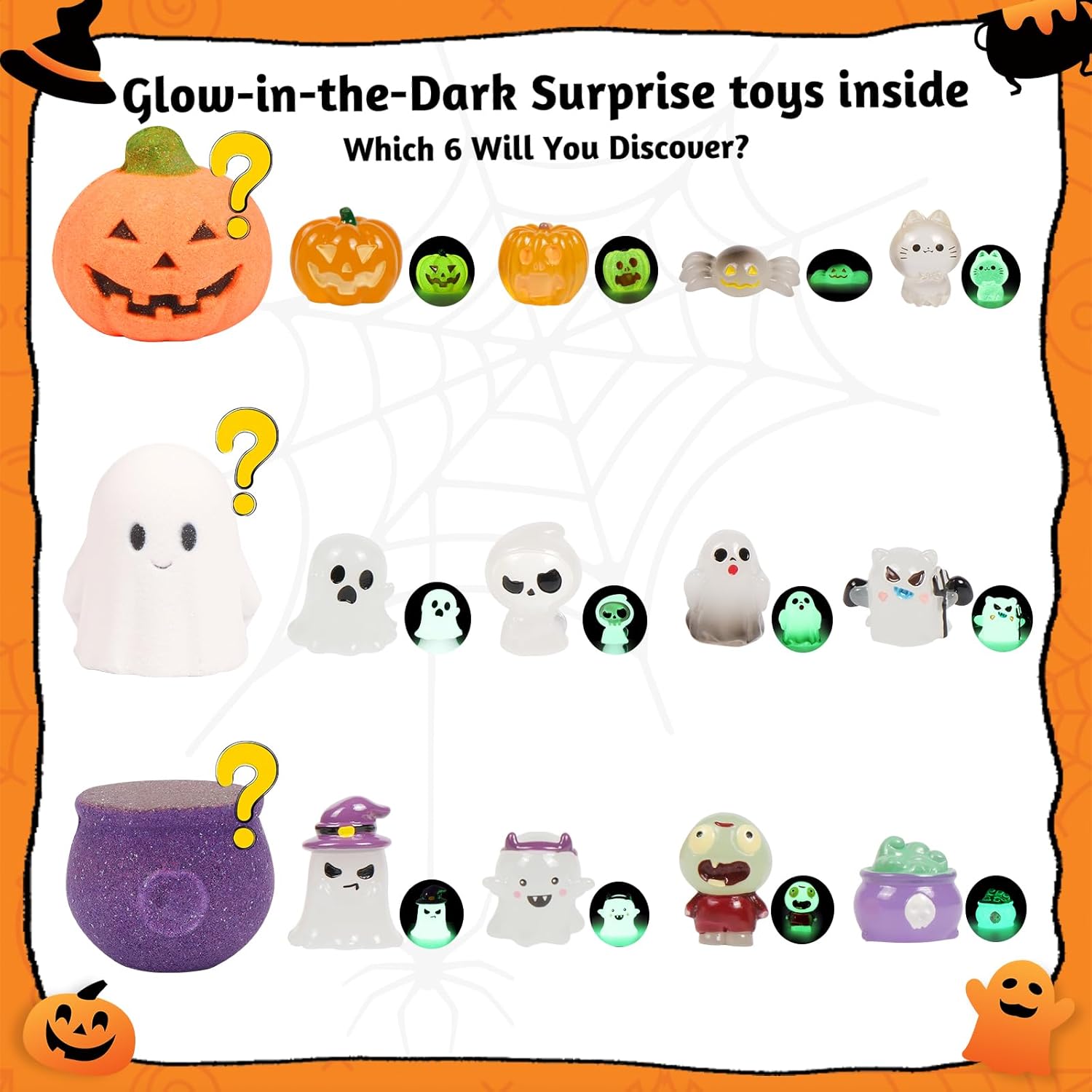 - 12 Glow Toys to Collect: Each bath bomb hides a surprise glow-in-the-dark Halloween toy. From 12 spooky styles, kids randomly discover 6āpumpkins, spider, ghosts, skeletons, etc, that lights up kidsā imagination long after the fizz fades, making bath time a thrilling discovery.