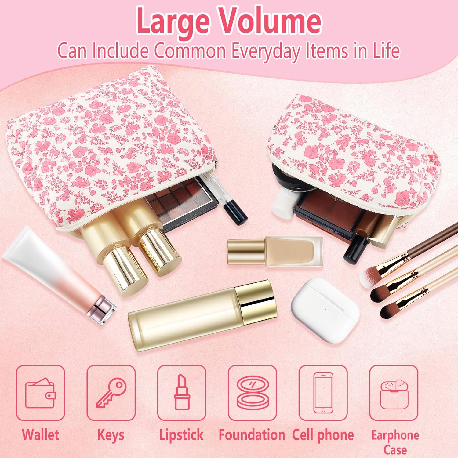 - TRAVEL MAKEUP BAG SET COQUETTE FOR WOMEN:You will get a large makeup bag and a small cosmetic bag (makeup brush bag).These floral makeup pouch is lovely and fashionable, the texture is lightweight and soft. These floral makeup pouch is cute and fashionable, lightweight and soft, easy to carry.Cute flower pencil case,pink pencil pouch