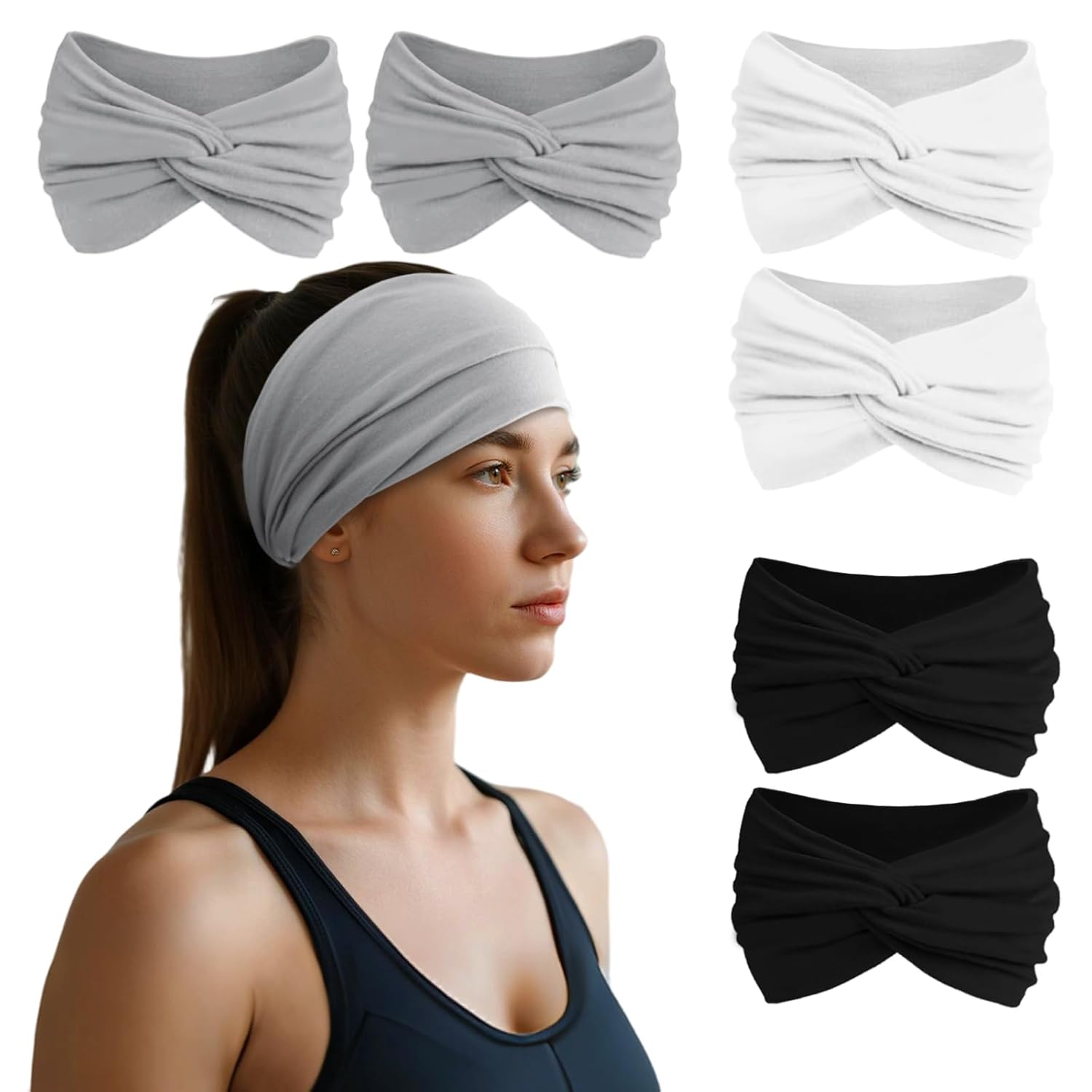 Headbands for Women, Non Silp Wide Hair Bands, Elastic Thick Head Bands, Stretchy Soft Sports Sweat Bands for Spa Workout Running Gym, Cotton Cloth Hair Accessories 6Pcs, Two Black/White/Gray