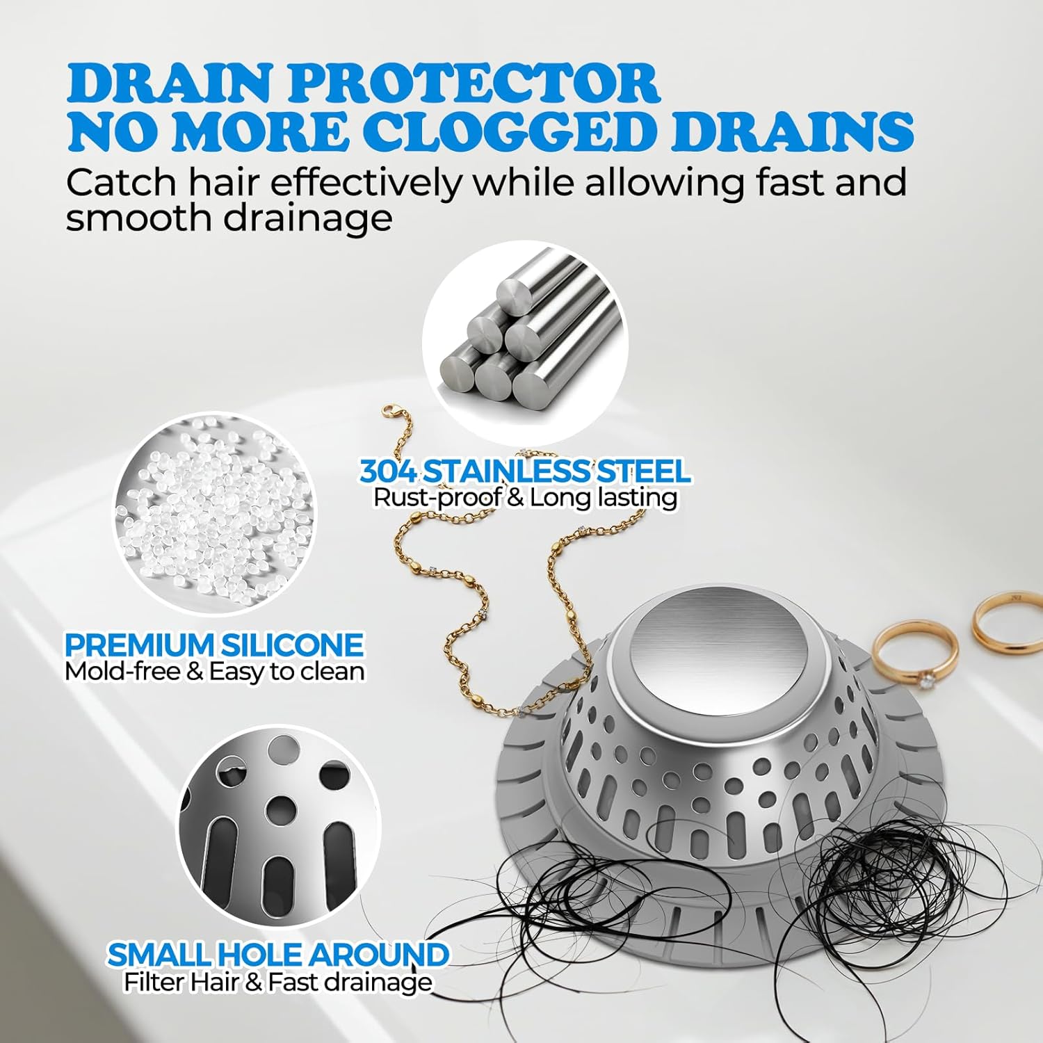 - 【Upgraded SUS 304 STAINLESS STEEL】This bathtub drain hair catcher is made of 304 stainless steel, rustproof and ant-corrosion. The thick steel ensure long-term lasting and durability. Also a perfect decor to your bathroom bathtub, tub, shower or sink