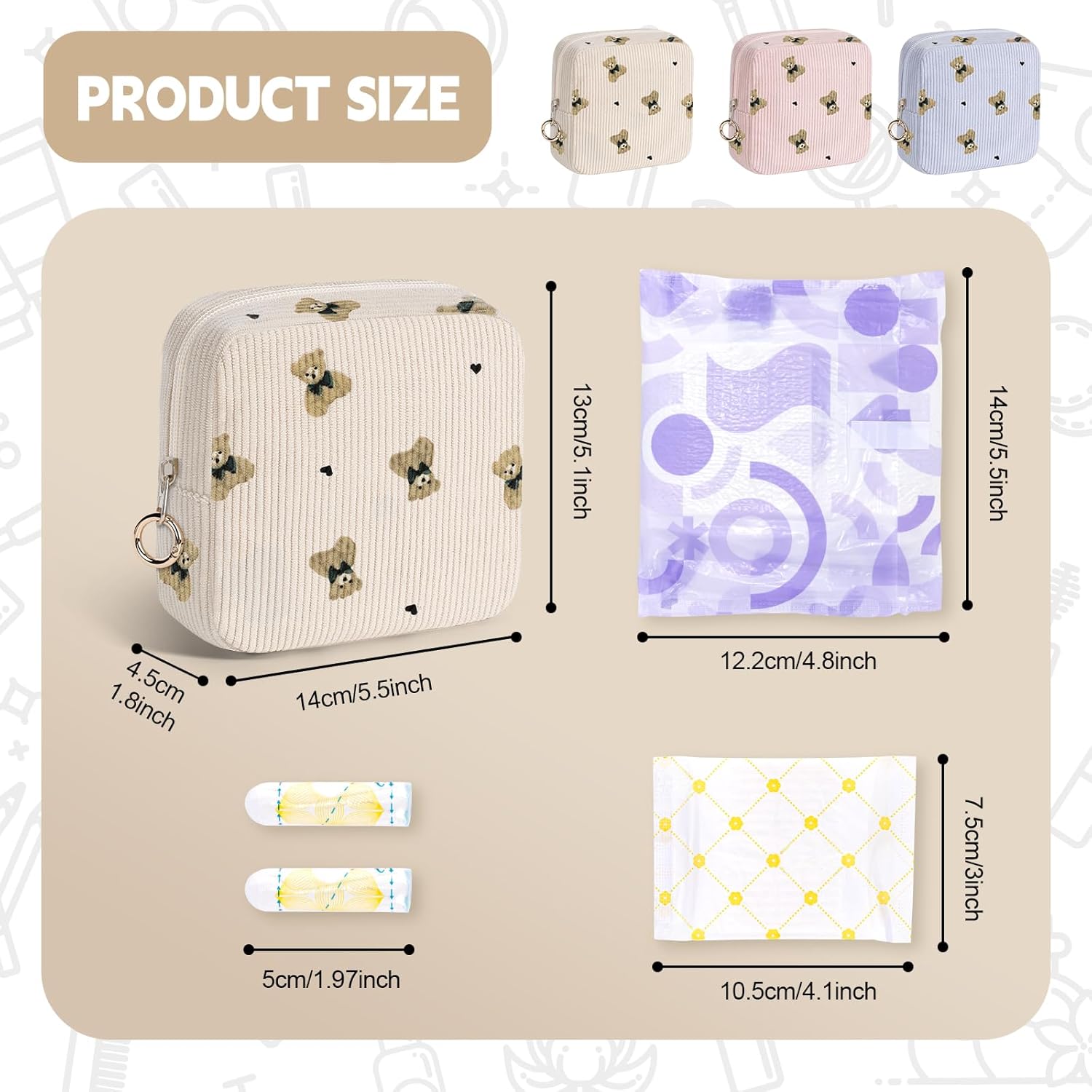 - 【Multi-style & Colorful Colors】The tampon organizer is available in your choice of color and multi-style. Cute bears tampon storage bag make of thickened corduroy fabric, soft, comfortable to touch, easy to clean, no fade