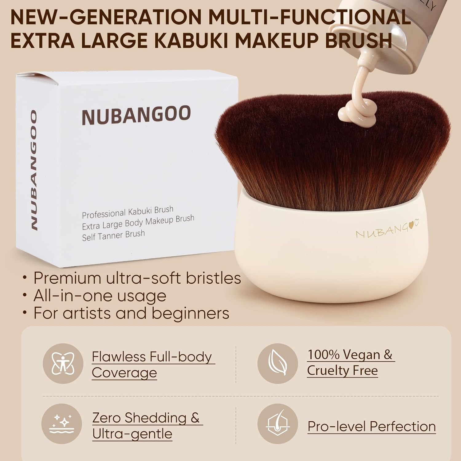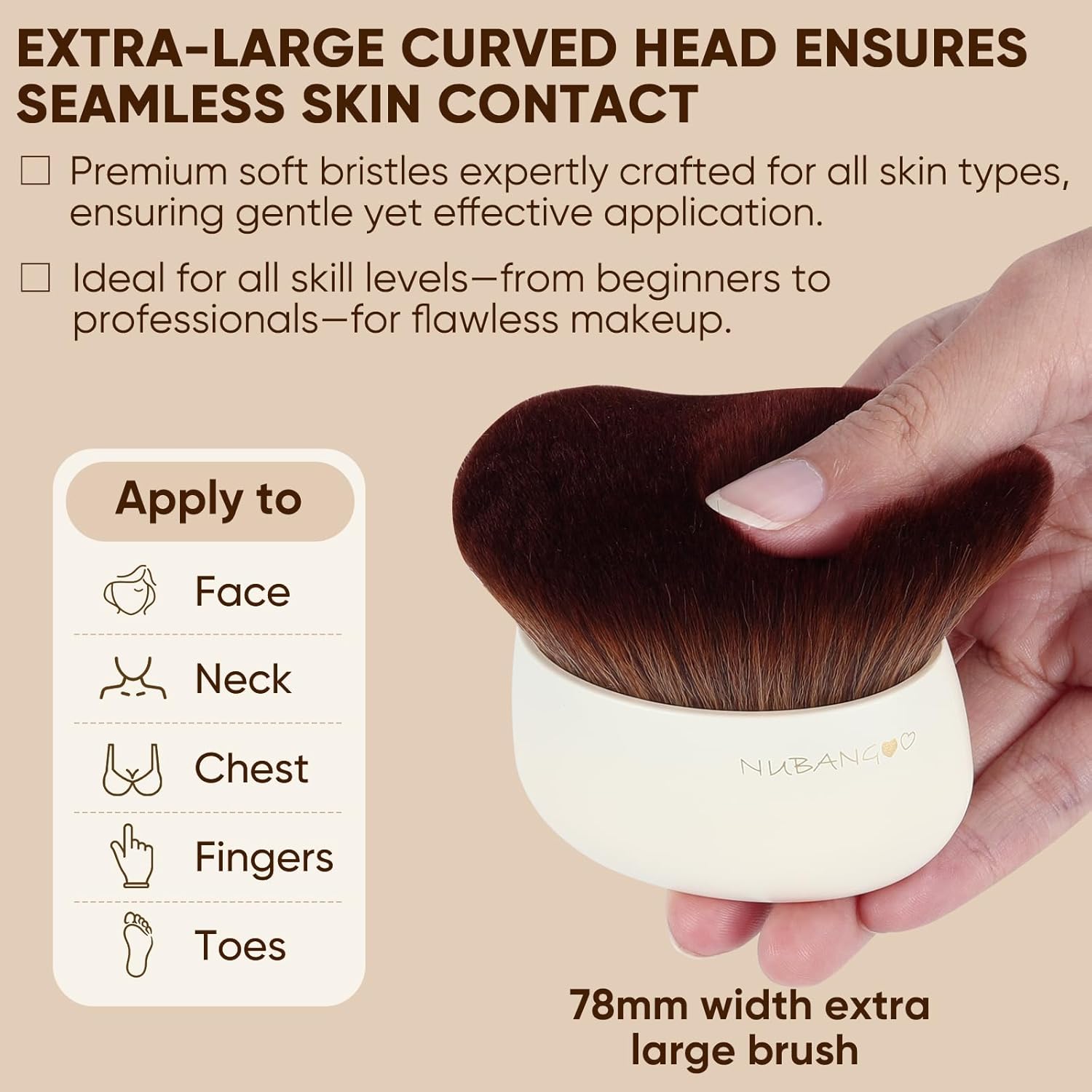 - ăAll-in-one usageă:This extra large Kabuki brush enables seamless application of liquid, cream, or powder foundation, bronzer, highlighter, and tanning agent to the face, neck, body, legs, and shoulders in just one simple step.