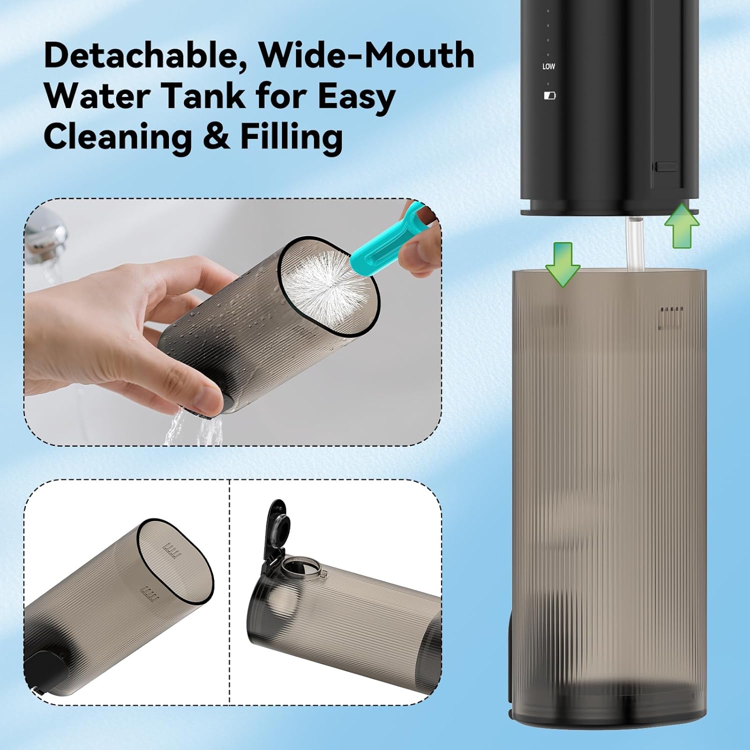 - Compact Design with Collapsible Water Tank â Easy to Fill, Clean and Store:Comes with a 200ml collapsible and detachable water tank that makes storage simple and supports easy daily refills and cleaning. The wide opening allows quick water filling and thorough rinsing. Built with IPX7 waterproof protection, The flosser is safe to use and rinse directly in the bathroom