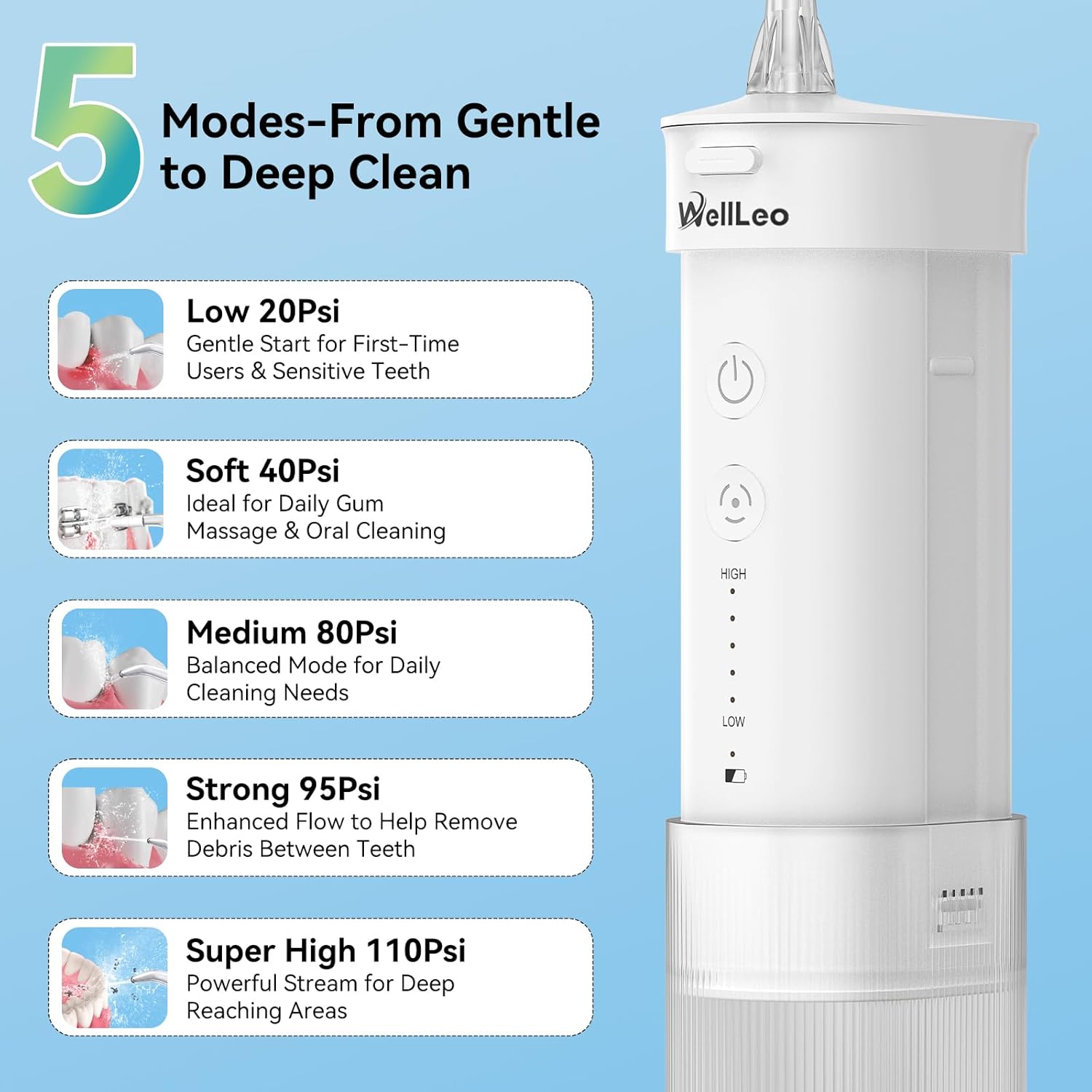 - 5 Cleaning Modes with Powerful Pressure and Smart Timer :The electric flosser Offers five cleaning modes ranging from gentle to powerful, whether you have sensitive gums, wear braces, or need a deep clean, there's a mode that fits your needs. The irrigador dental delivers strong water pressure for more effective plaque removal. The built-in smart timer automatically powers off after two minutes to help guide proper cleaning time