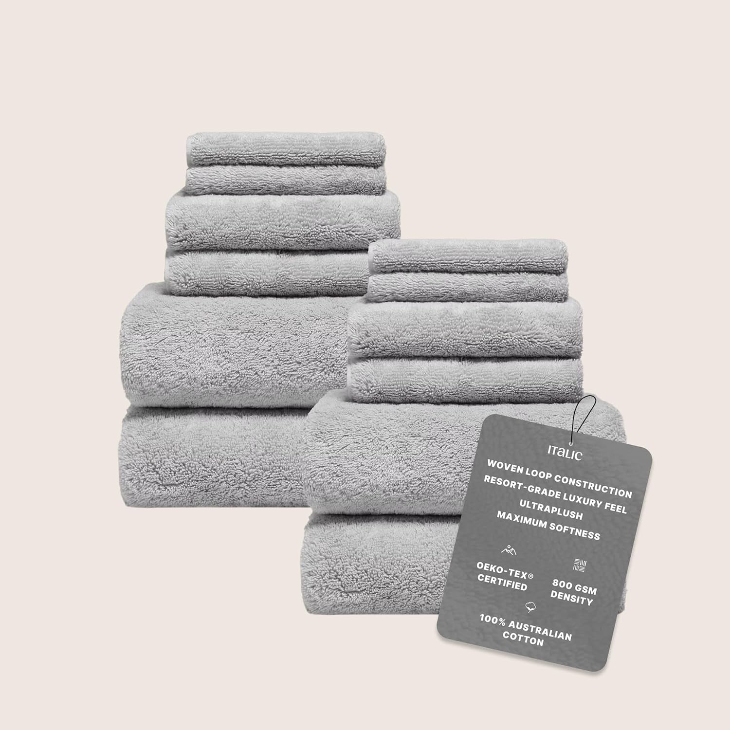 Italic Ultraplush 12-Piece Family Towel Set – Luxury Bath Towels, Hand Towels & Washcloths – Plush, Quick Dry 800GSM 100% Australian Cotton for Bathroom & Spa (Light Gray)
