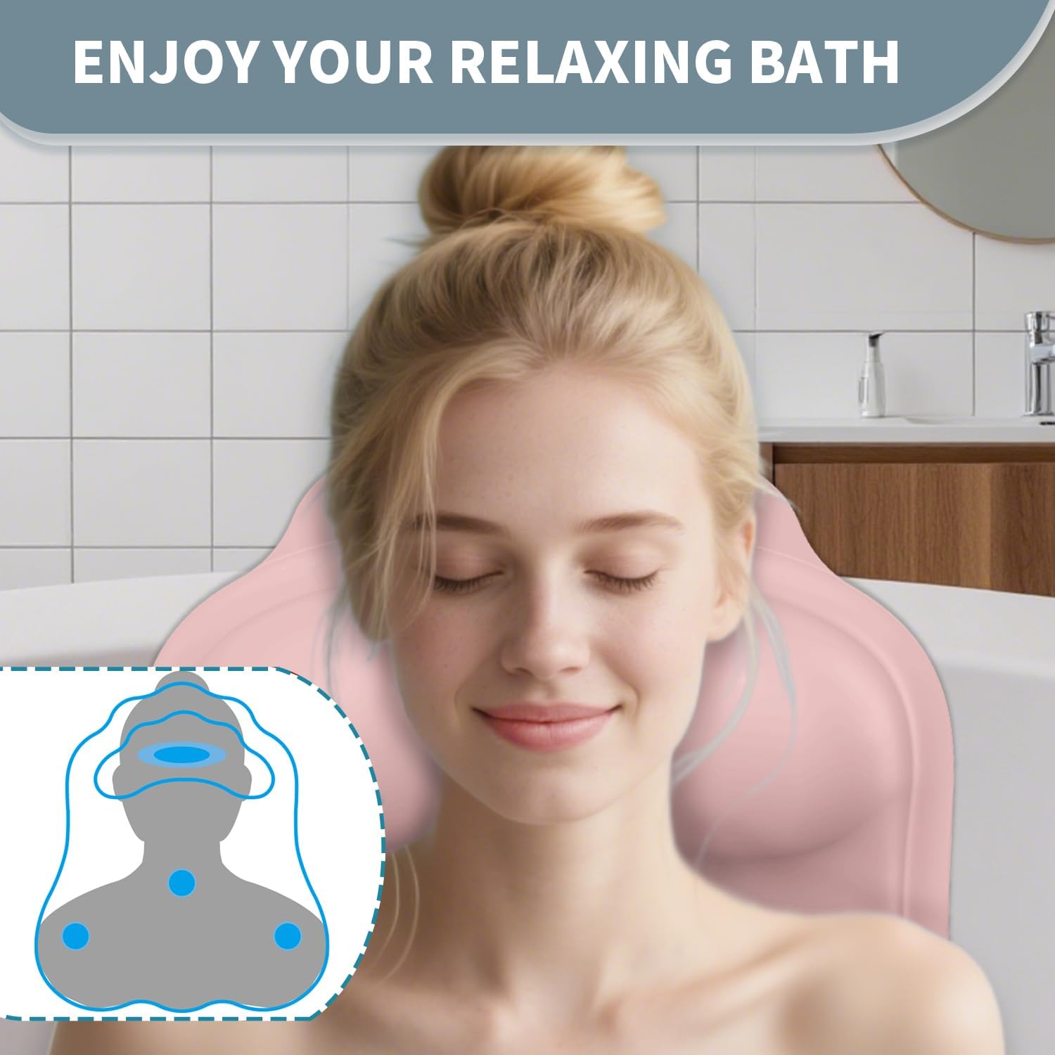 Silicone Bath Pillow for Tub – Ergonomic Bathtub Headrest with Inflatable Air Cushion, Non-Slip Suction Cups & Neck/Back Support – Comfortable Spa Bath Accessory for Relaxation (Pink)