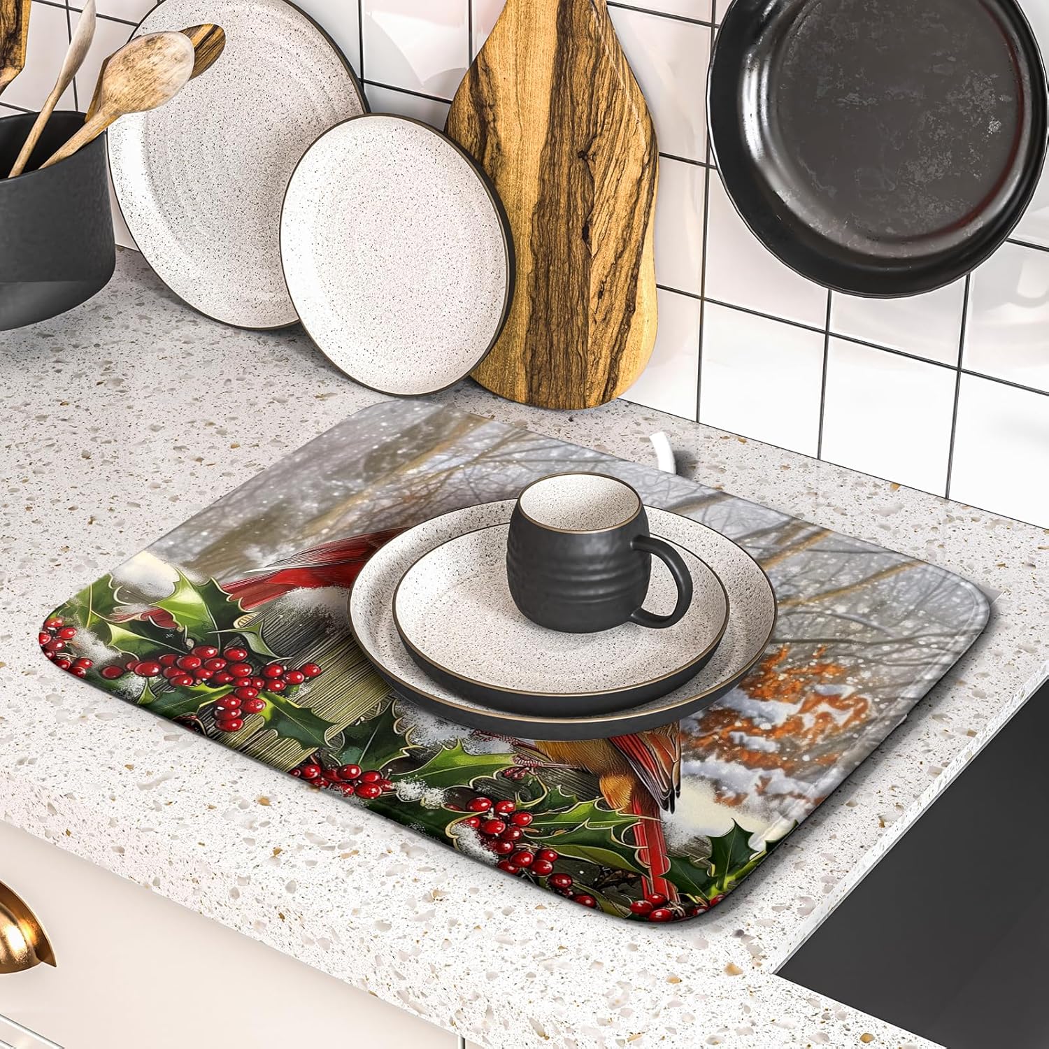 Winter Birds Dish Drying Mat Red Berry Dish Drainer Rack Mat Microfiber Absorbent Dish Drying Pad for Kitchen Counter Coffee Bar 16x18 Inch
