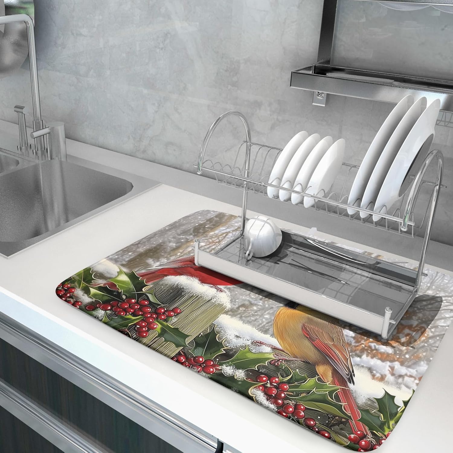 Winter Birds Dish Drying Mat Red Berry Dish Drainer Rack Mat Microfiber Absorbent Dish Drying Pad for Kitchen Counter Coffee Bar 18x24 Inch