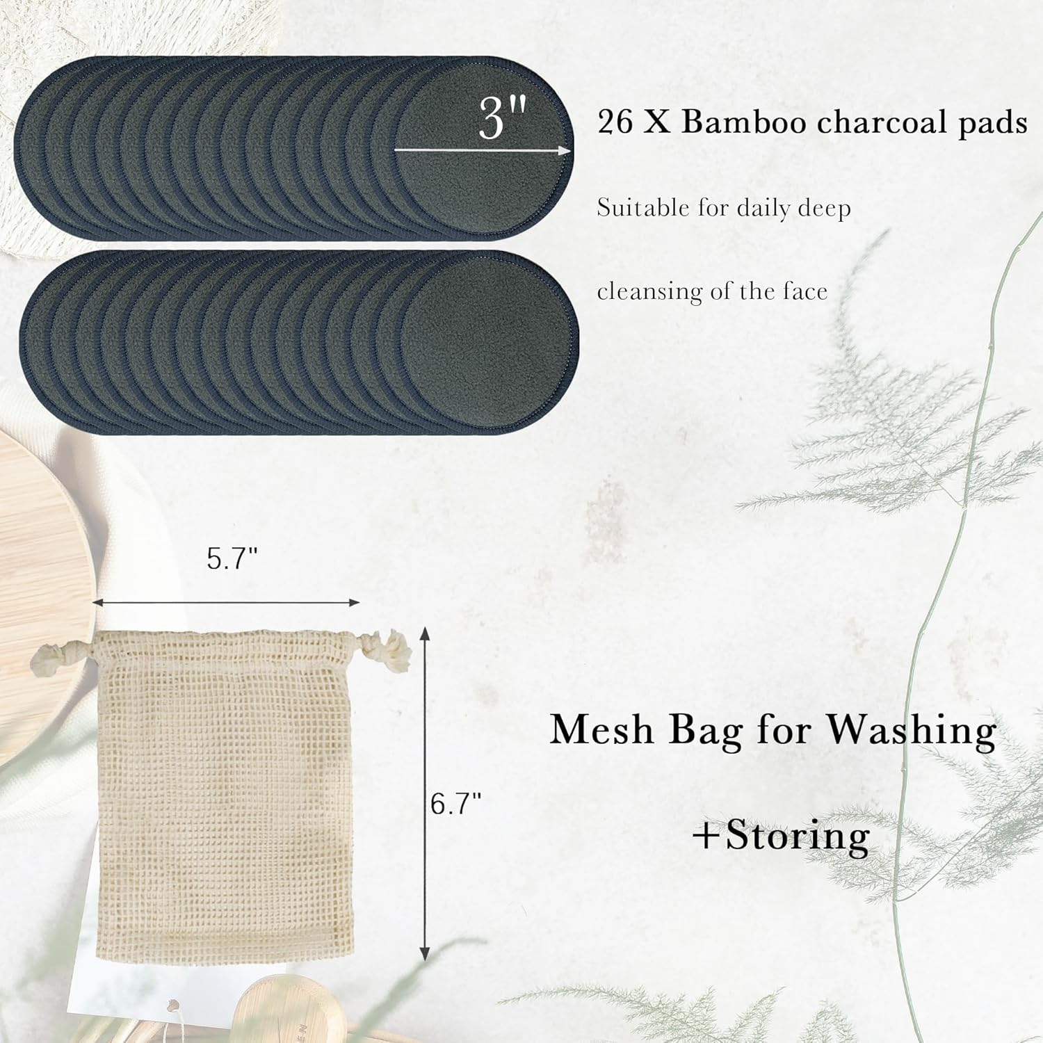 Reusable Bamboo Charcoal Makeup Remover Pads - 26 Packs Reusable Cotton Rounds with Cotton Bag | Organic, Zero Waste, Gentle for All Skin Types | Double-Sided Washable Bamboo Cotton Rounds