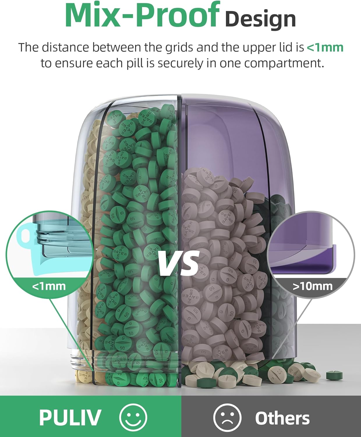 - Say Goodbye to Mixing Pills: PULIV jumbo medication organizer with the design that the distance between the grids and the upper lid is close to ensure anti-mixing pills. Stop being troubled by pills mixing when pouring. Please note: This organizer is not suitable for storing gummy vitamins. For optimal use, store in a dry place and avoid direct sunlight exposure