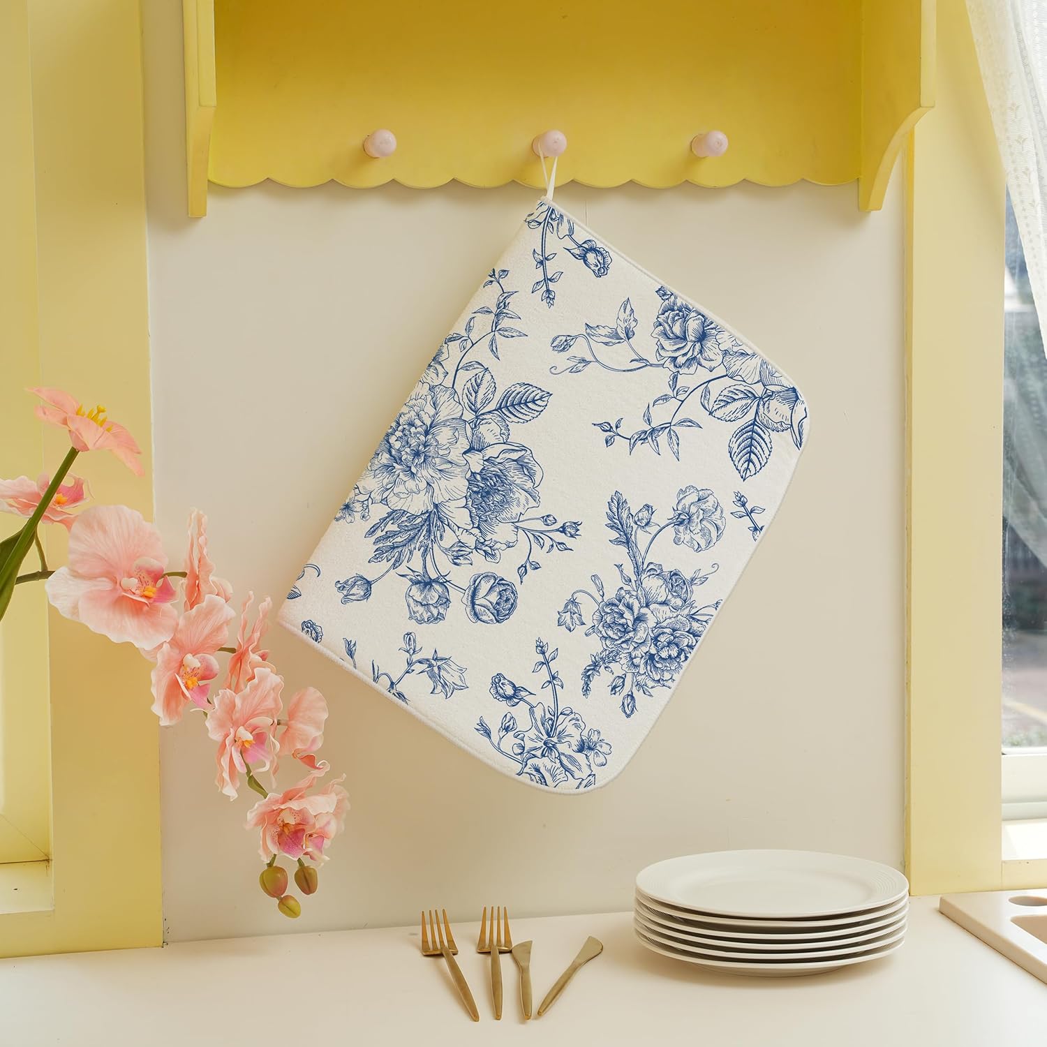 Blue Floral Dish Drying Mat for Kitchen Counter, 18x24 Inch Chinoiserie Flower Absorbent Dish Drying Pad Heat Resistant Mat Coffee Bar Mat Dish Drainer Rack Mat