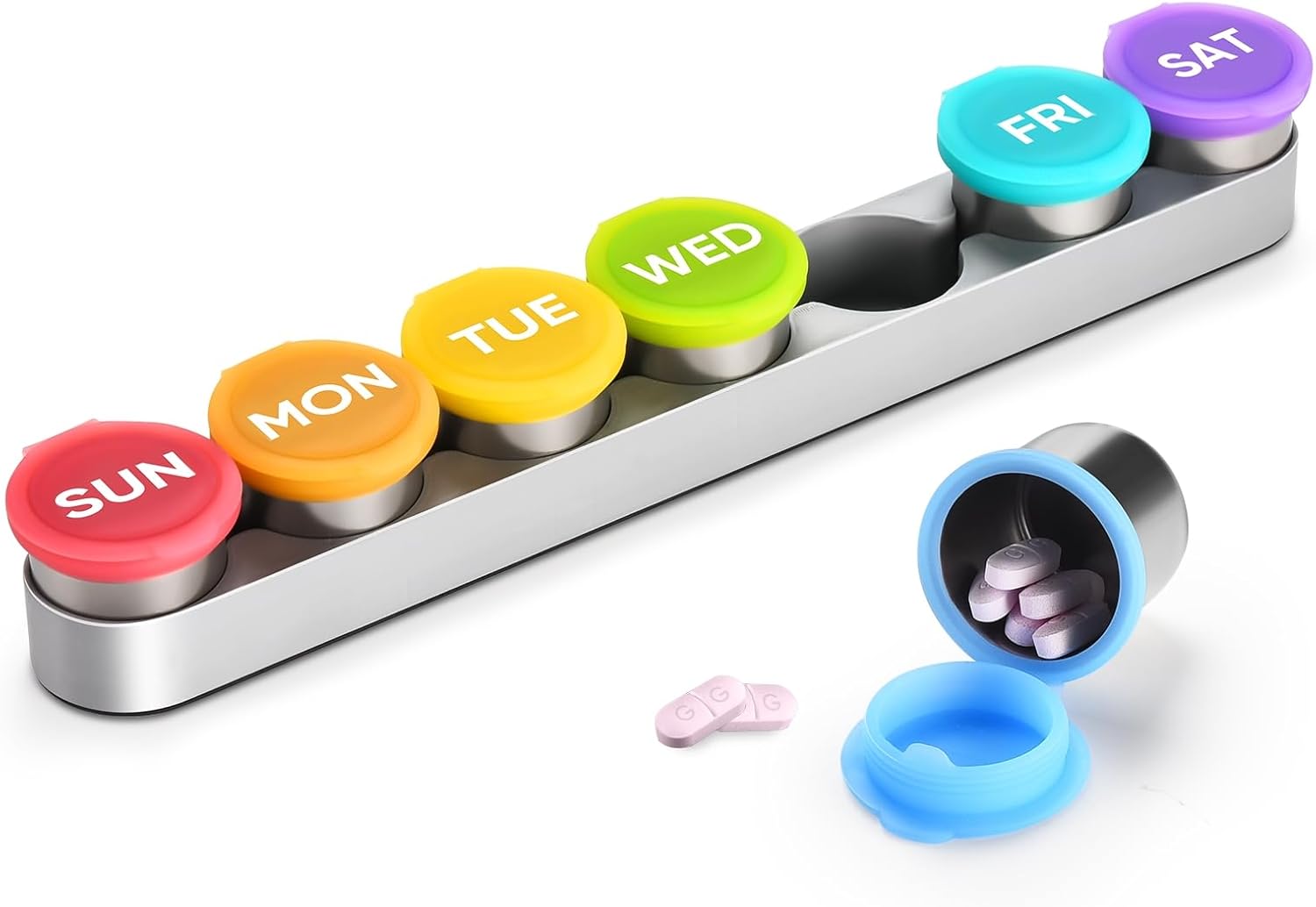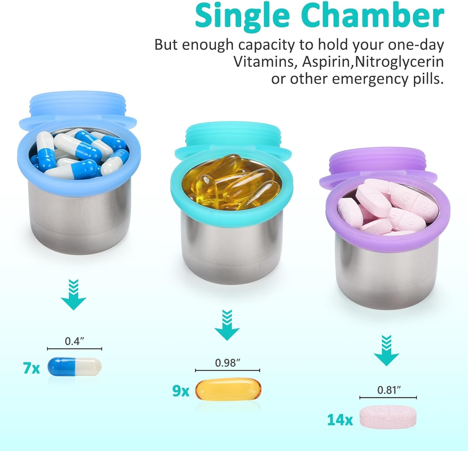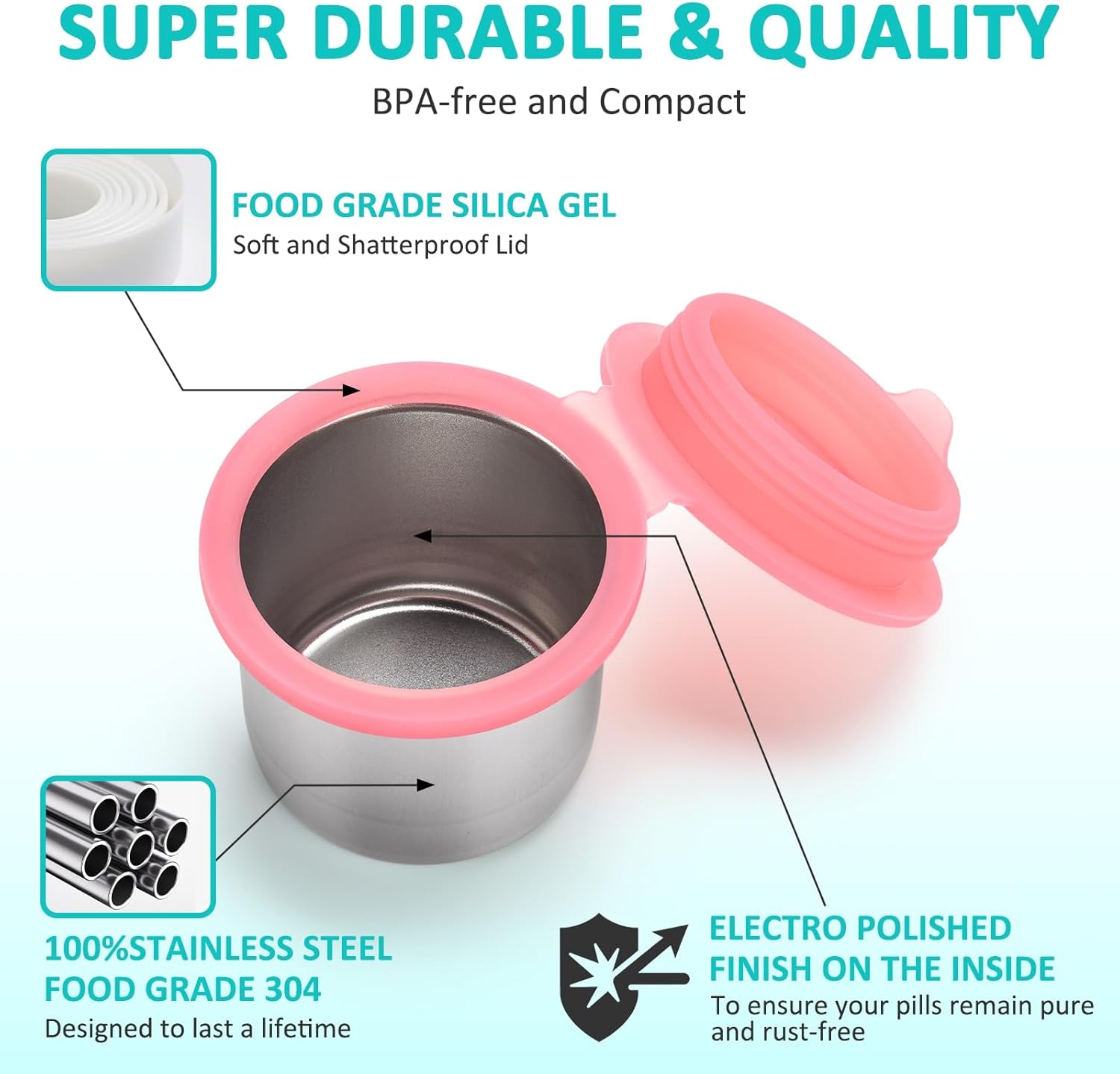 - SUPERIOR MATERIAL - The body is made of a whole piece of 304 Stainless Steel , and the cover of pill box is made of BPA-free Silica Gel. With excellent hand feel and simple design, the pill box is very sturdy and durable. Say goodbye to the plastic medicine box.
