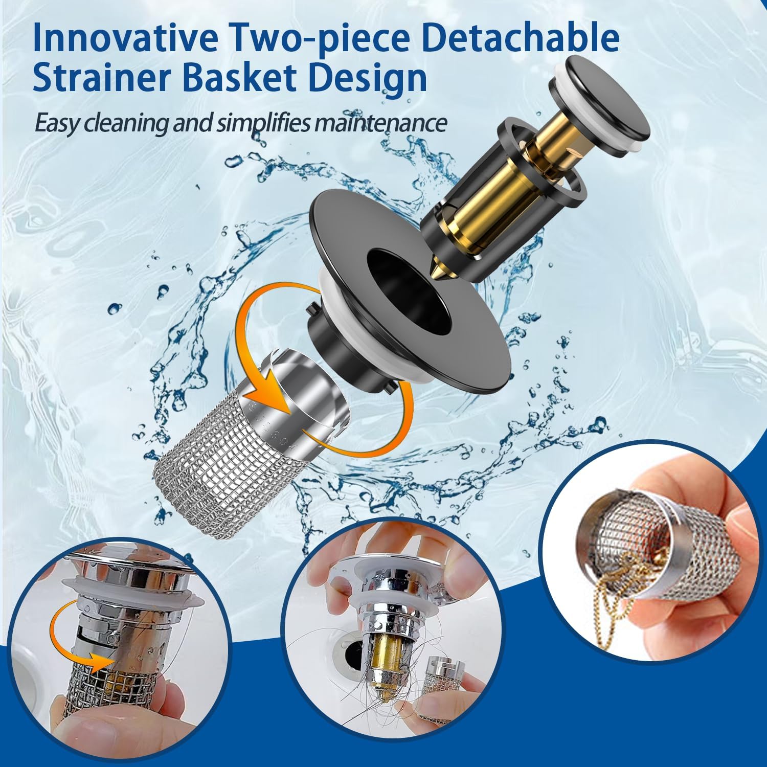 - đĽ ă2-in-1 Innovative Design ăOur sink bounce core drain strainer features an advanced 2-in-1 design that seamlessly integrates an anti-clogging basket. It combines clogging and filtration to effectively intercept hair and debris, prevent clogging, and ensure smooth drainage. With this smart design, you will experience hassle-free maintenance and an always clog-free sink