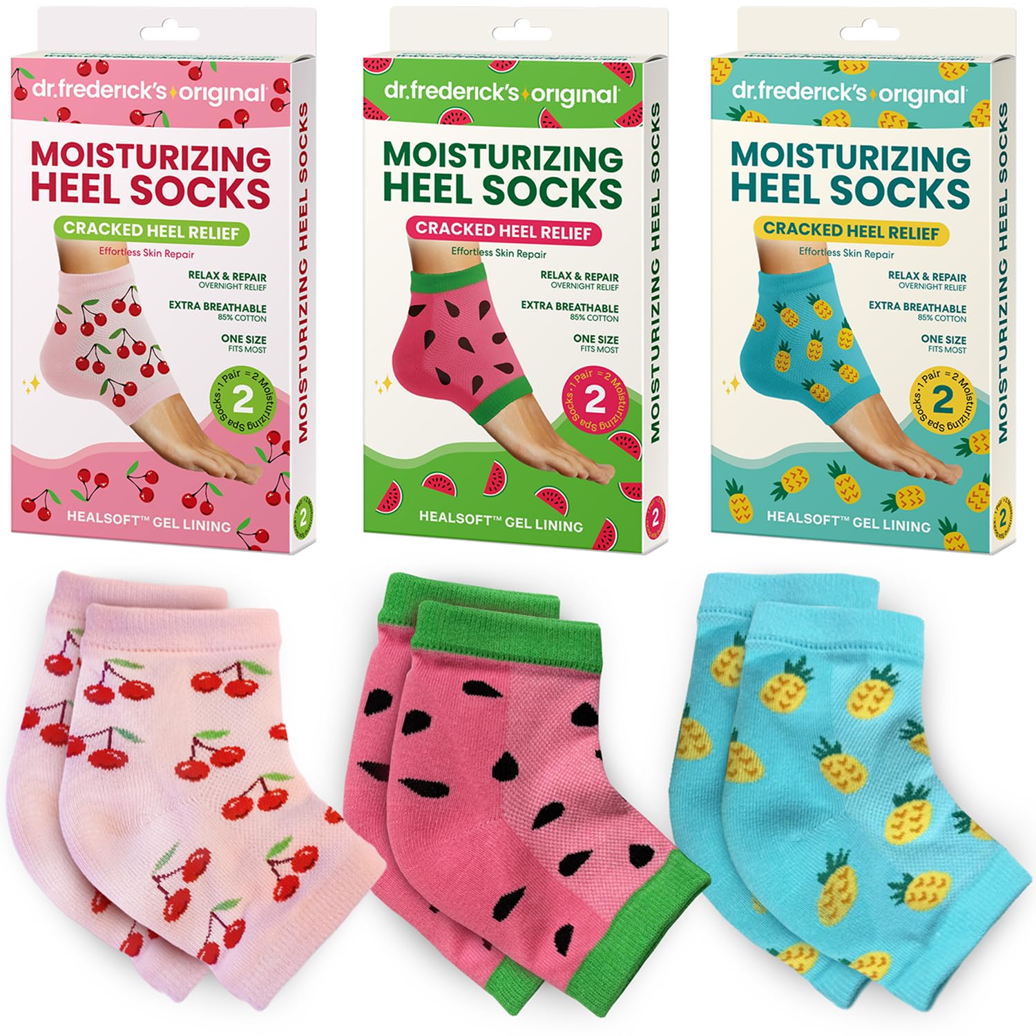 - Fast Cracked Heel Repair for Sandal Season: Dr. Frederickâs Original Moisturizing Heel Socks are now available in fun cherry, watermelon, and pineapple prints: because foot care can be both effective and fun. Lined with our new HealSoft Gel, these socks deliver visible hydration in as little as 7 days, making them your new go-to for summer-ready feet.