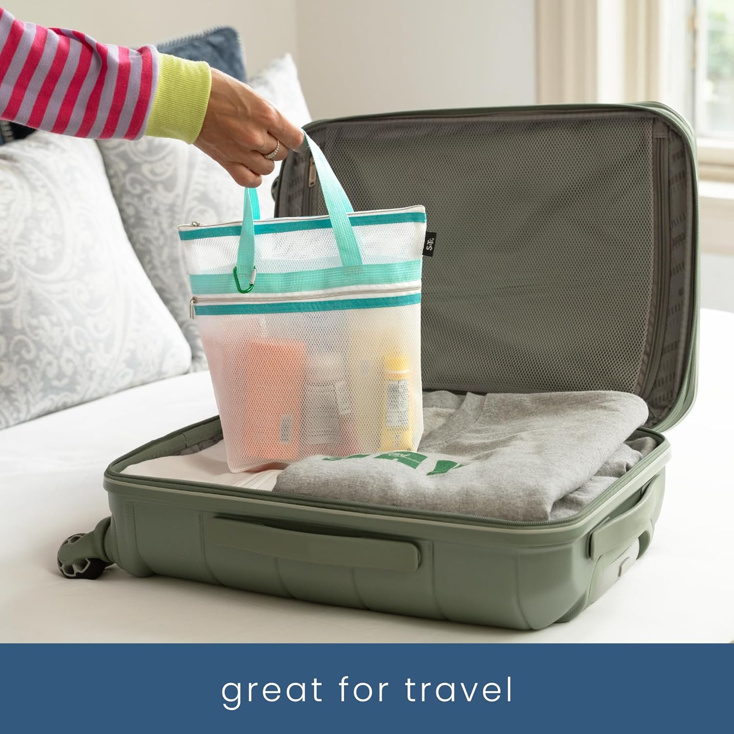 S&T INC. Mesh Shower Caddy, Shower Bag for Dorm Room Essentials, Gym Bag, Camping and More, Two Zippered Pockets, White and Teal, 10 Inches x 10 Inches