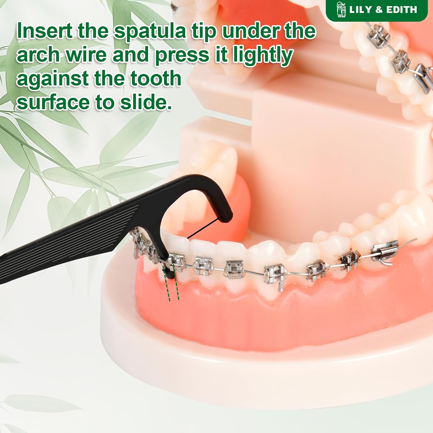 - BAMBOO CHARCOAL HANDLE â Unlike traditional plastic flossers, our braces floss picks handles are made with bamboo charcoal to help reduce plastic waste while offering a sturdy, comfortable grip.