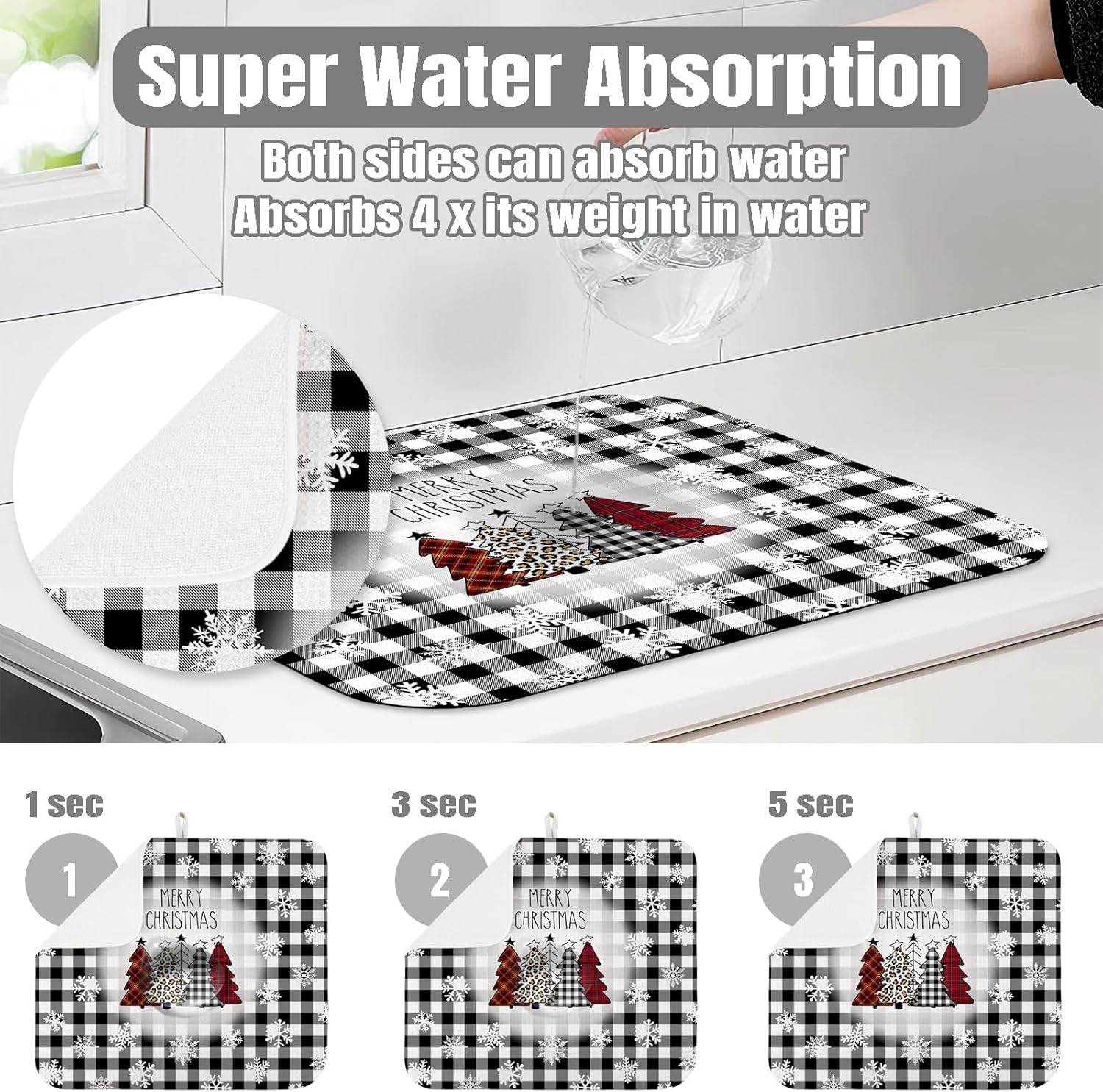 Dish Drying Mat for Kitchen Counter Large 18" x 24" Buffalo Plaid Christmas Tree Absorbent Microfiber Dishes Drainer Rack Mats Pad Reusable Washable