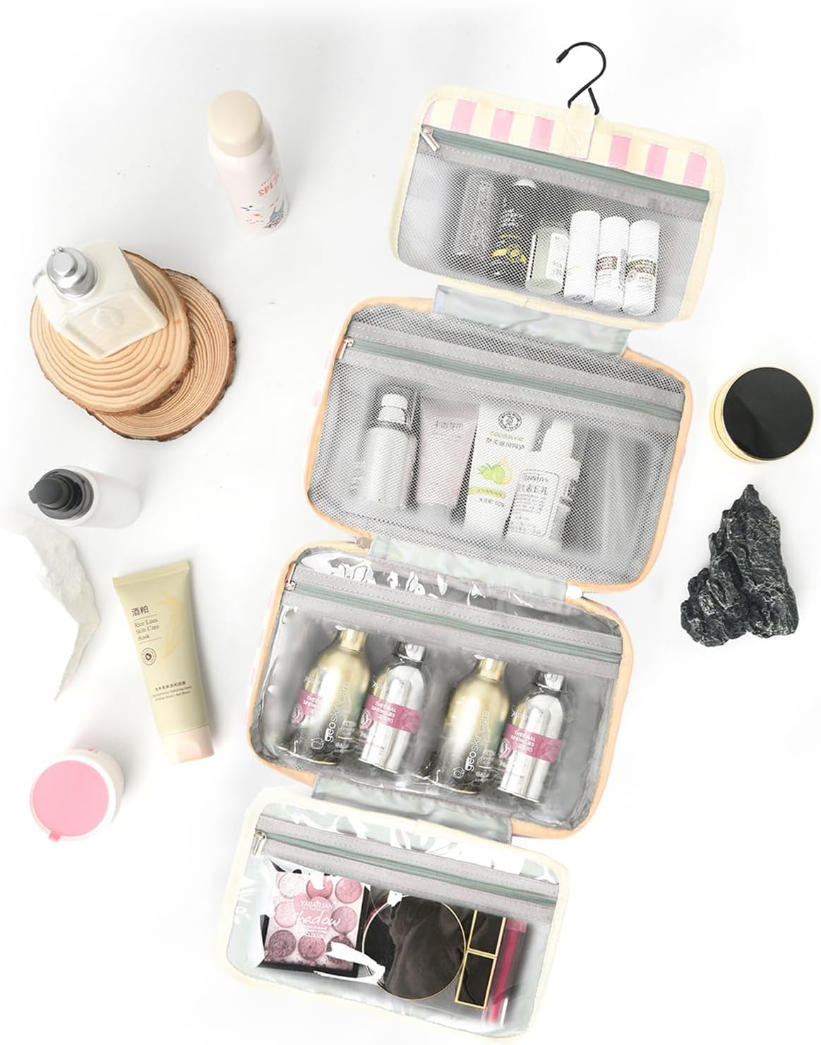 Toiletry Bag for Women Travel Water-resistant Cosmetic Bag Fashion Stripes Makeup Bag with Hanging Hook Preppy for Store Toiletries Cosmetic Accessories Large Capacity Pink