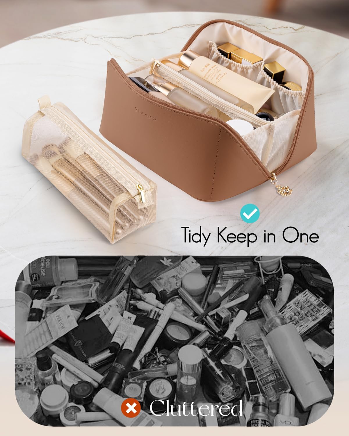 Vlando Makeup Bag,Large Capacity Travel Toiletry Bag,Cosmetic Bags for Women PU Leather Waterproof Portable Pouch with Divider & Handle-Brown