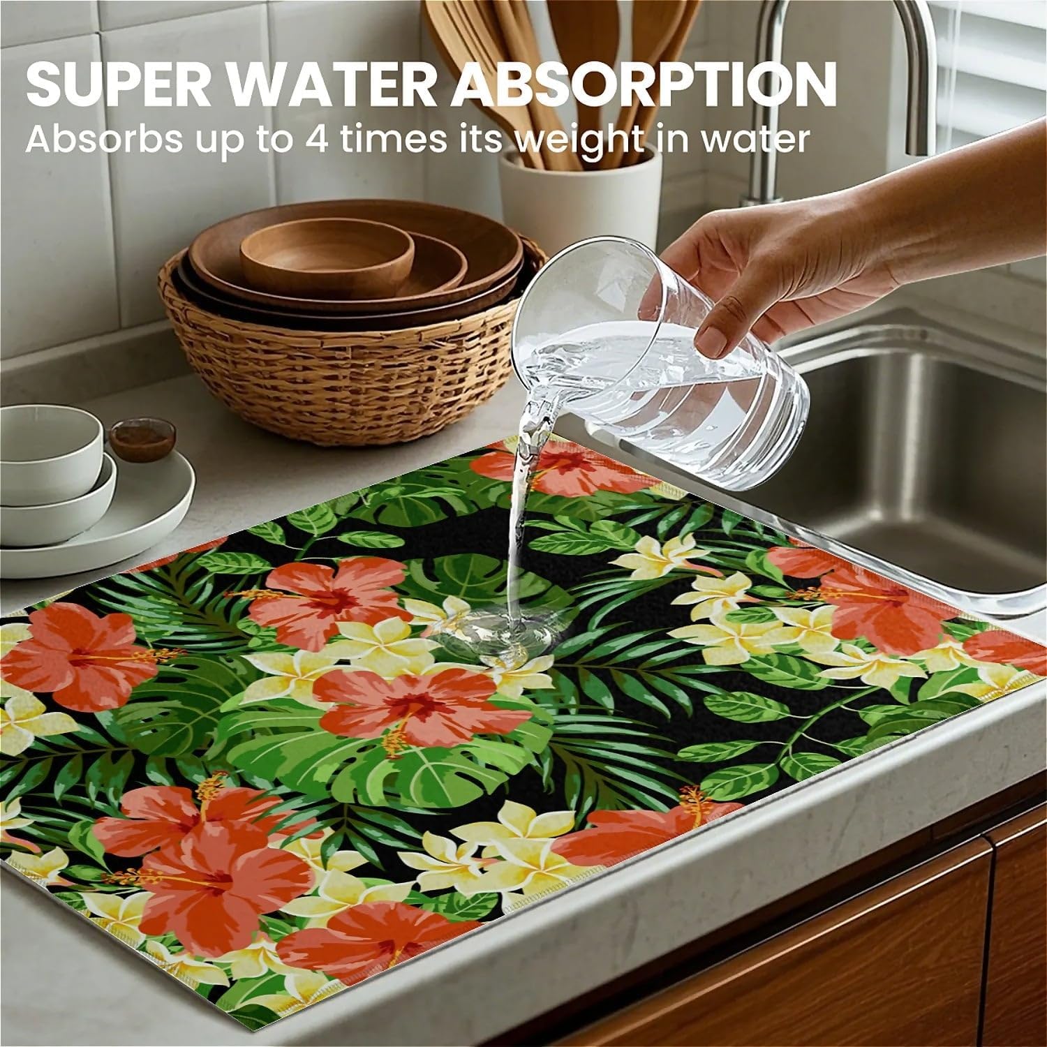 Dish Drying Mat For Kitchen Counter, Tropical Flower On Black Microfiber Absorbent Dish Drainer Rack Pad Reusable Large 18x24in Drying Mat
