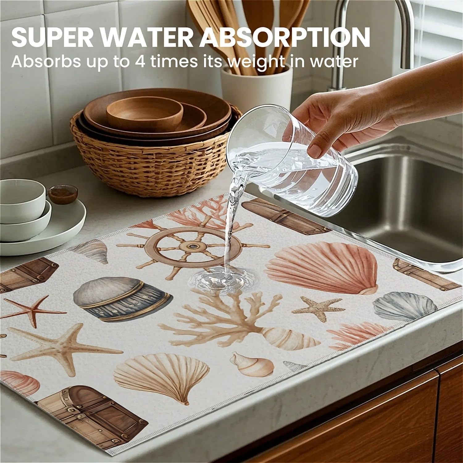 Dish Drying Mat For Kitchen Counter, Seashells Starfish Coastal Microfiber Absorbent Dish Drainer Rack Pad Reusable Large 18x24in Drying Mat