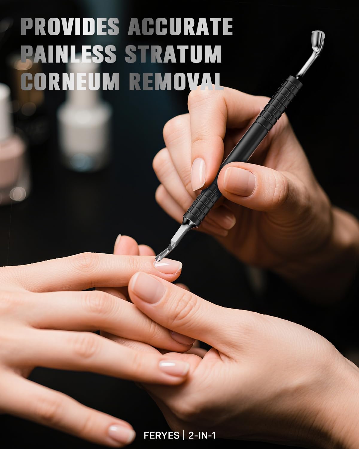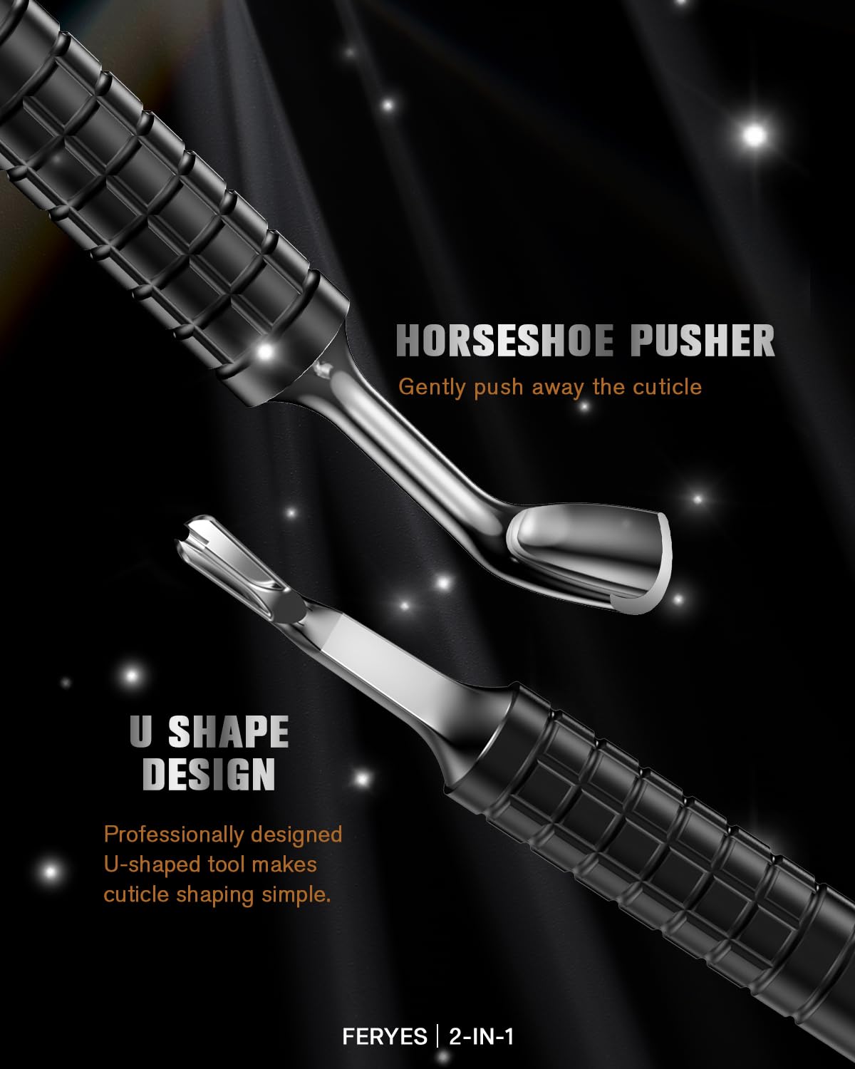 FERYES Upgraded Horseshoe Shape Cuticle Pusher with Fork, 2-in-1 Cuticle Remover Tool, Stainless Steel Cuticle Trimmer Nail Care Tool for Manicures- Black(5.6 Inches)