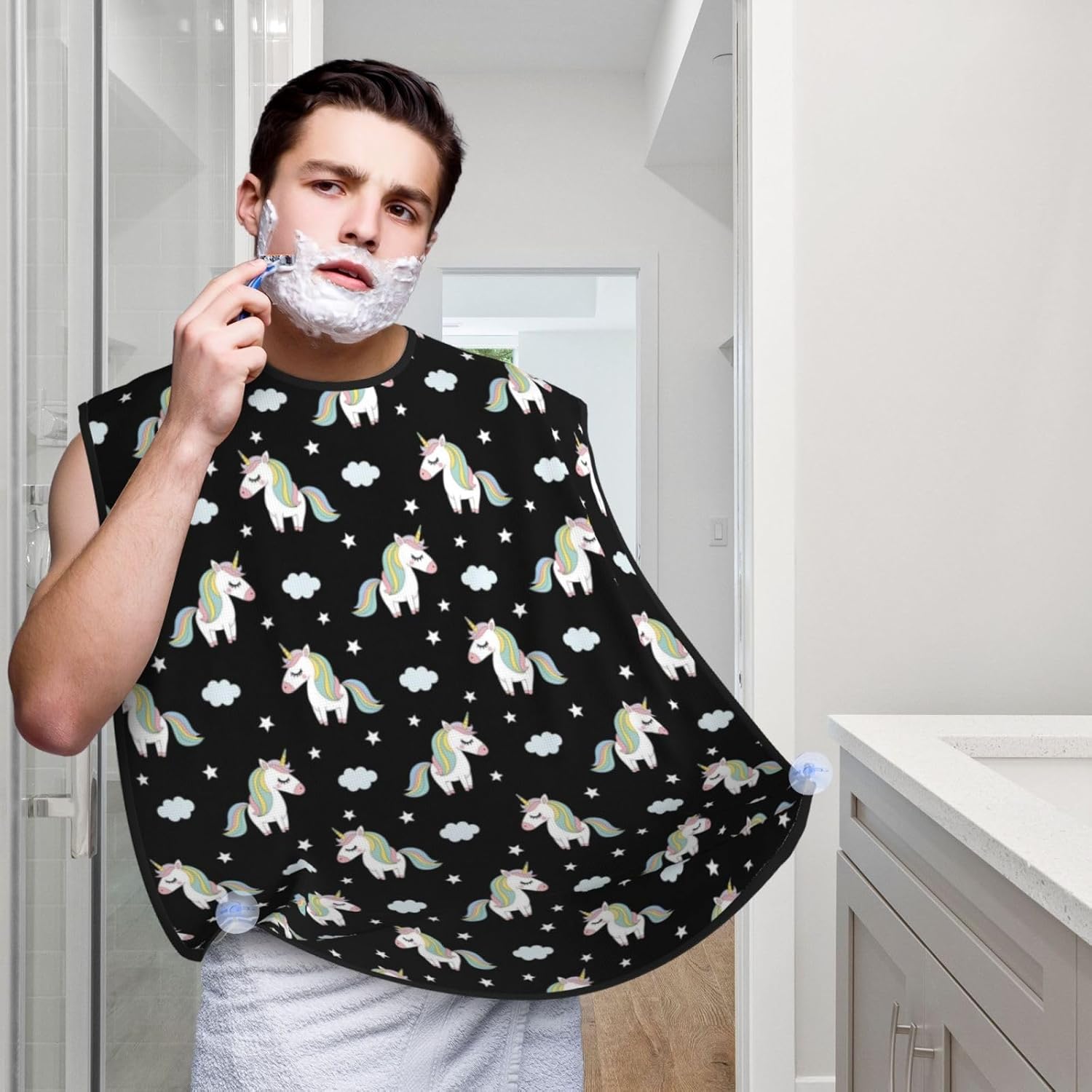 Men's Shaving Accessory Rainbow Unicorn Star Black, Waterproof Beard Apron with Hair Catcher & Suction Cups
